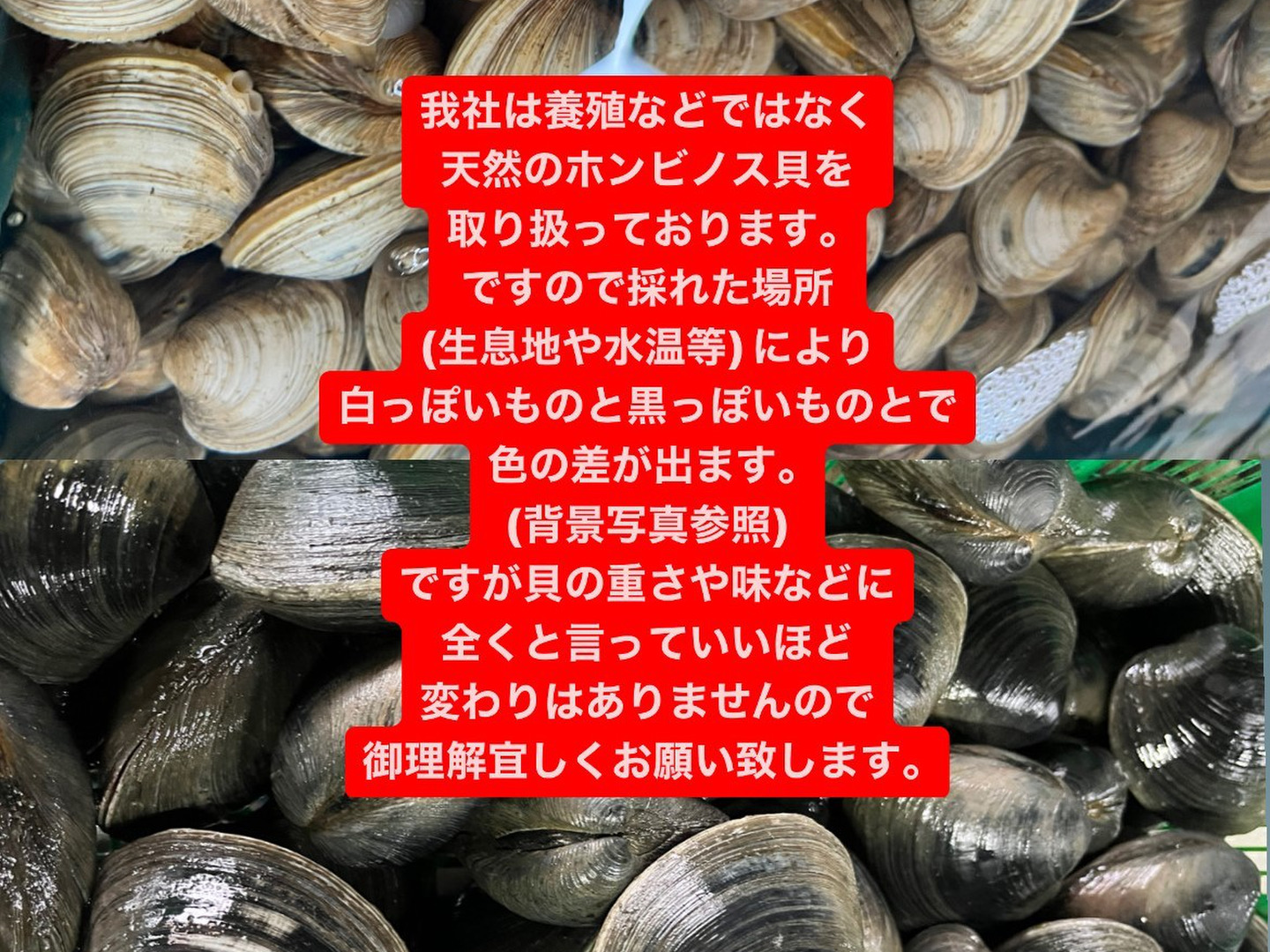 ※漁獲場所の水温や水深または海底の底質によって殻色が変色し白色、又は黒色の物もありますが中身は変わらないのでご了承ください。