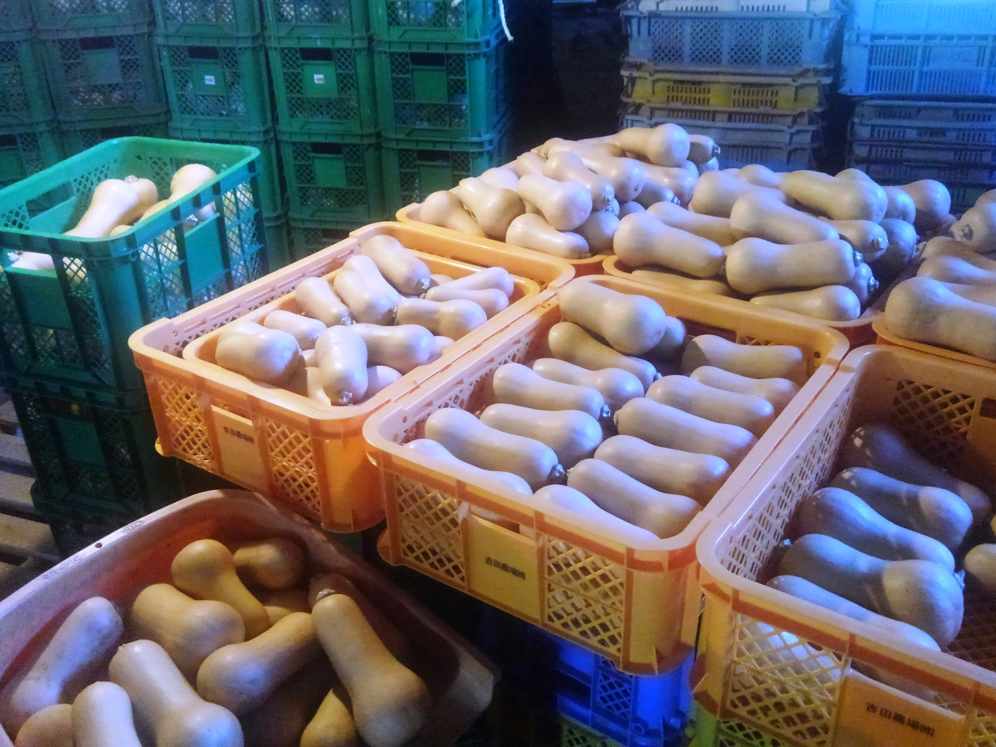 貯蔵庫内の土間(①温度変化が少ない。②直射日光が当たらない。③風通しが良く湿気が溜まらない。)で、バターナッツかぼちゃの貯蔵・追熟を行っています。