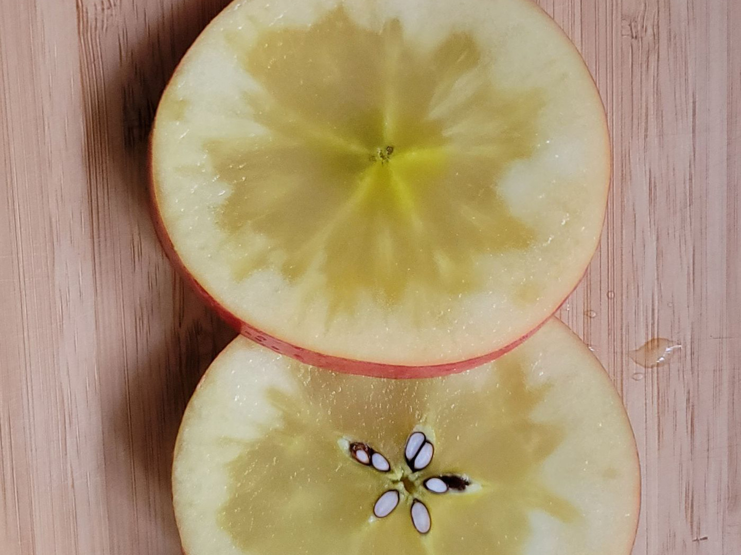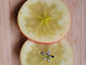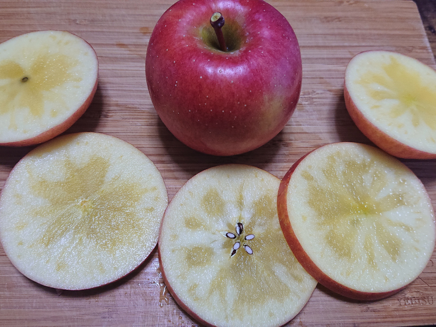 輪切りにすると蜜入りが特徴的な品種です!良くわかります❗皮の方まで蜜入りしているので、光を下からかざすとりんごがひかります✨️