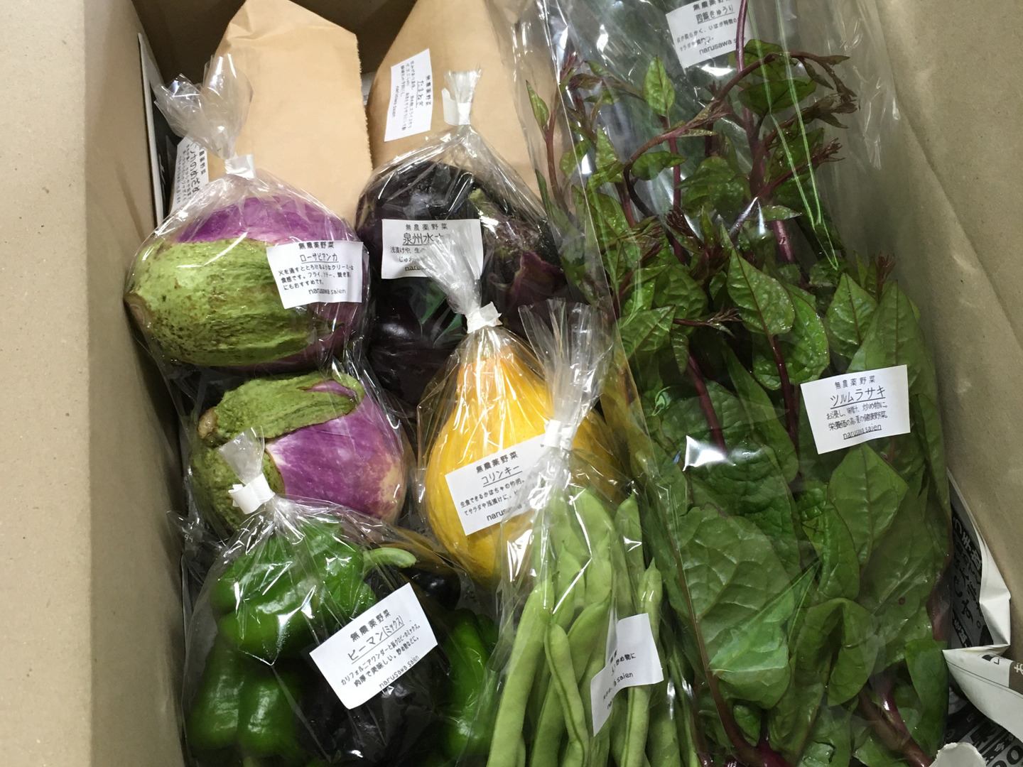 栽培期間中農薬不使用で育てた朝穫り野菜を、7〜10種類程度セットにしてお届けいたします。
