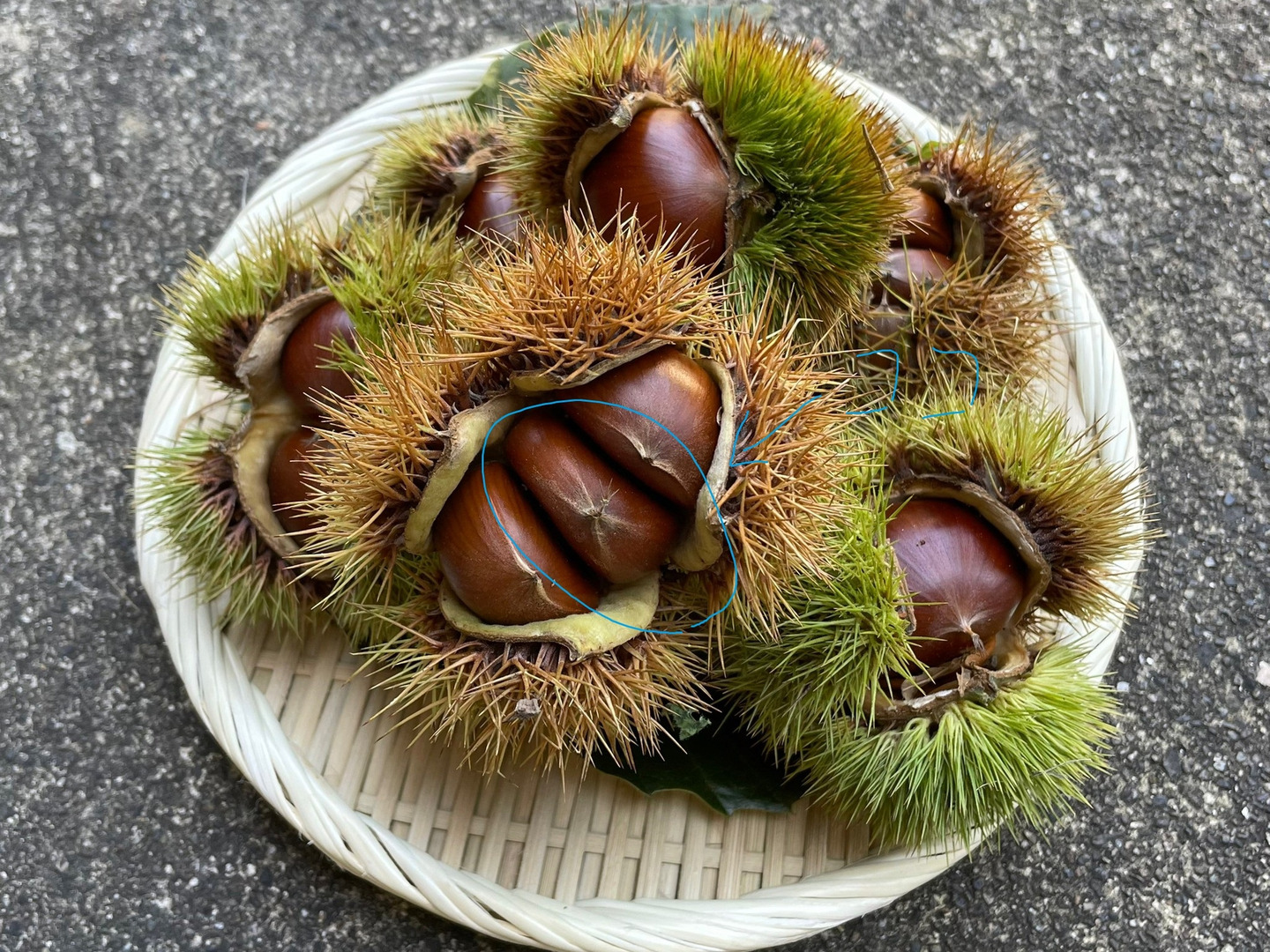 3つのうち、両サイドの栗はまるまる大きく育つのですが、挟まれているので『ぷっくり』と育たず平ぺったいカタチをしています。かつ、化学肥料を使っていませんのでサイズも大きくなりません。