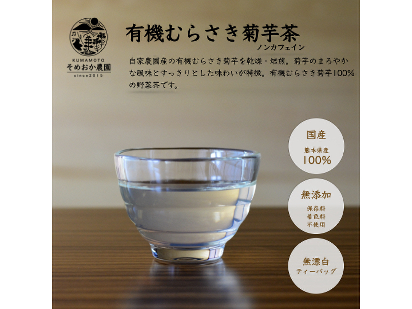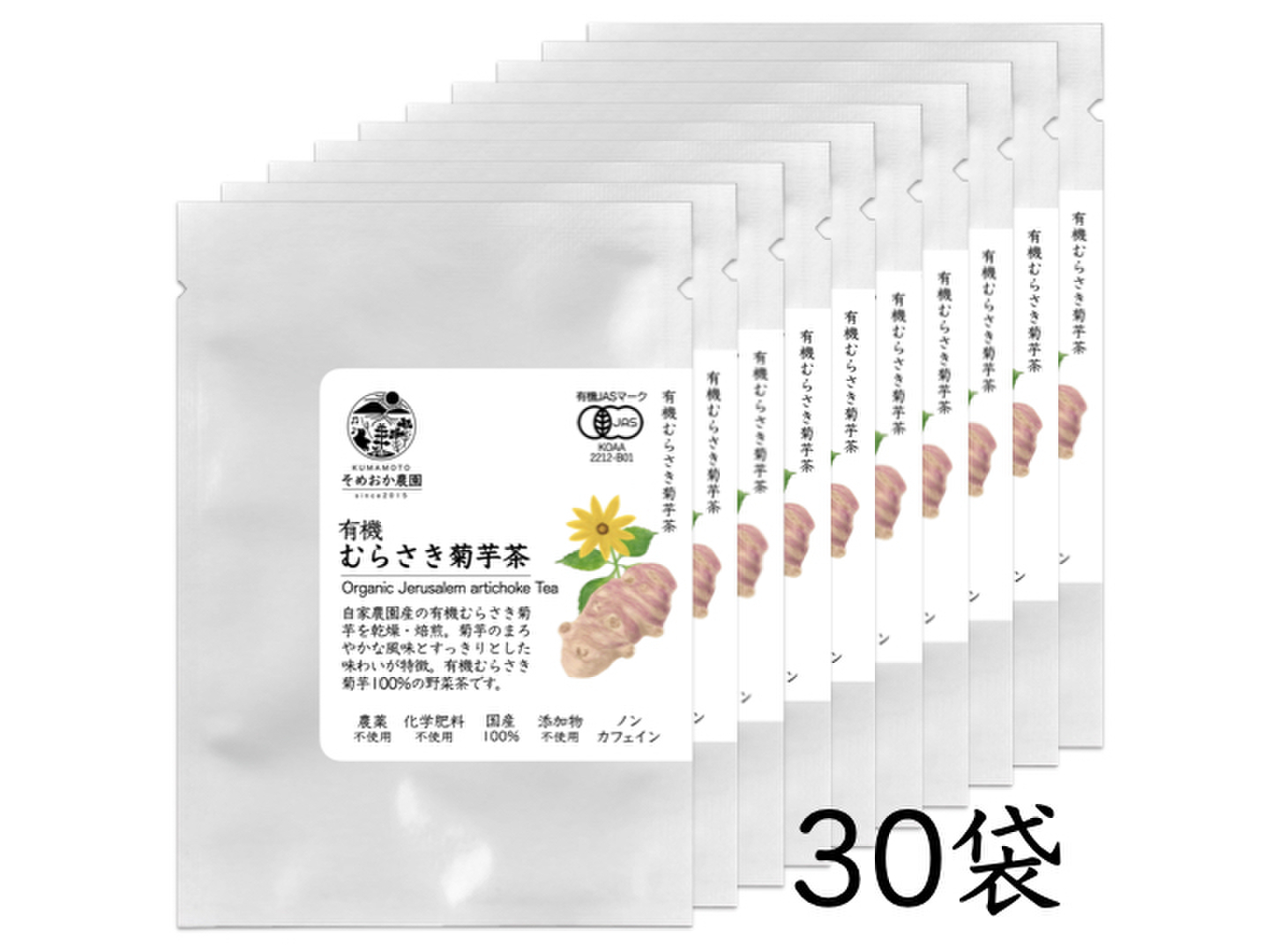 自家農園産の有機むらさき菊芋を乾燥・焙煎。菊芋のまろやかな風味とすっきりとした味わいが特徴。有機むらさき菊芋100%の野菜茶です。