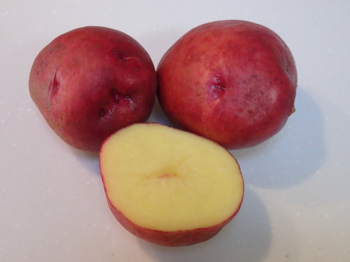 外皮は紅色、中は黄色の、ほくほくおいしいじゃがいもです。