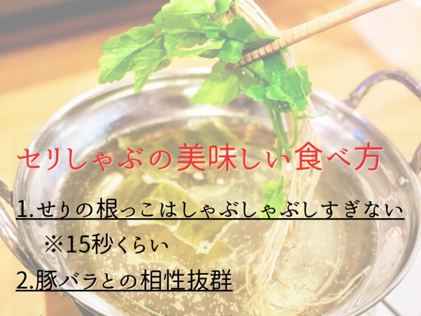 ※セリ、根っこはのしゃぶしゃぶ目安は15〜20秒ほどが美味しい食べ方です。