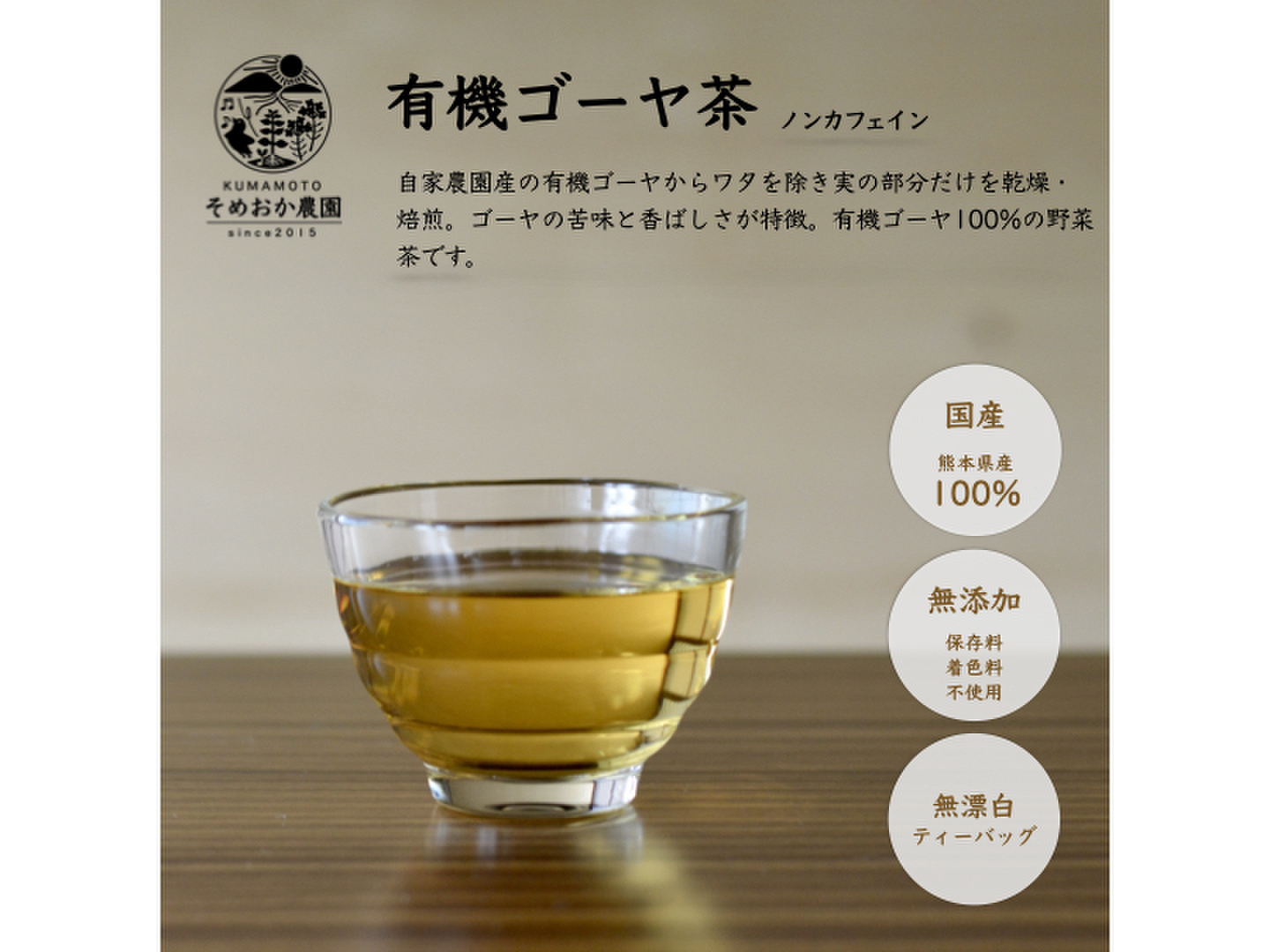 自家農園産の有機ゴーヤからワタを除き実の部分だけを乾燥・焙煎。ゴーヤの苦味と香ばしさが特徴。有機ゴーヤ100%の野菜茶です。