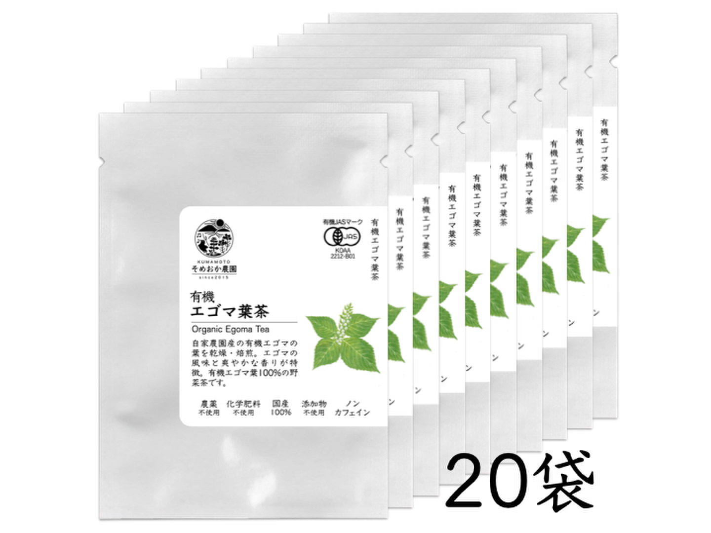 自家農園産の有機エゴマの葉を乾燥・焙煎。エゴマの風味と爽やかな香りが特徴。有機エゴマ葉100%の野菜茶です。