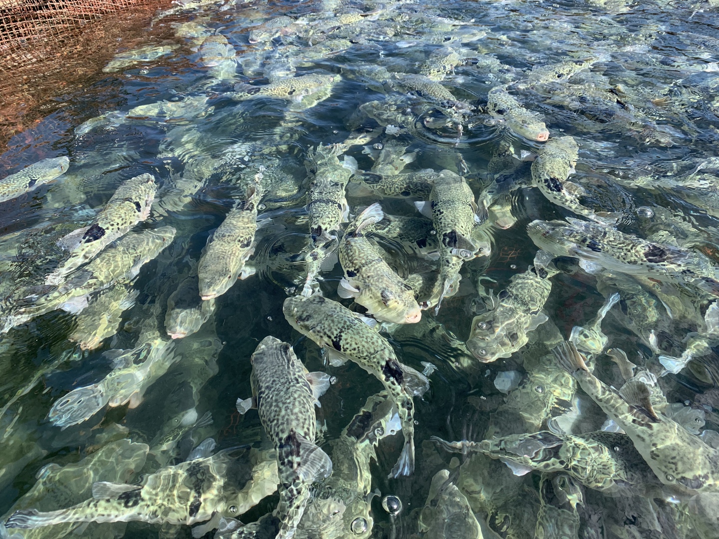 金政水産ではとらふぐの養殖を始めて30年以上経ちますが年々変化する環境に毎年試行錯誤しながら大切に育てています。餌に黒糖を混ぜて与えるなどこだわりをもっており、健康でコクと旨みのある金政水産ならでは黒糖とらふぐです。