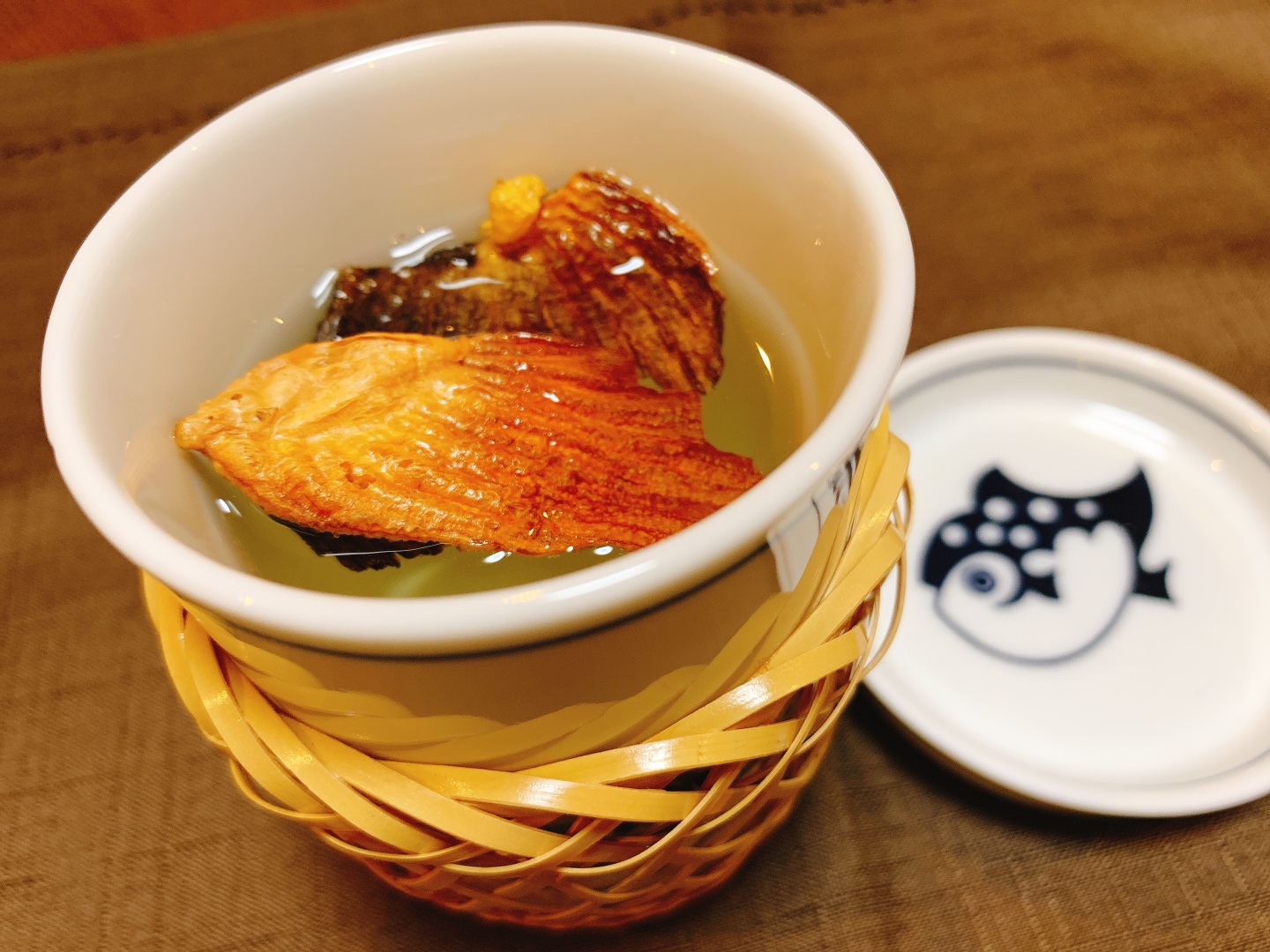 ●ひれ酒はコップまたは湯呑みにひれを入れ、上から70〜80℃に温めた日本酒を注いで1分ほどおいてからひれを引きあげてお飲みください。