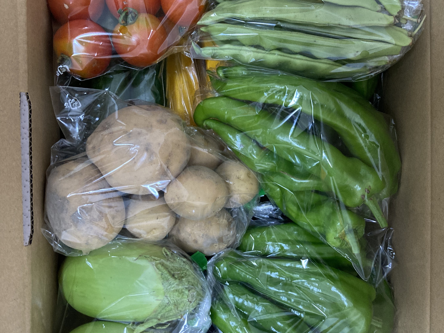 写真の用に袋に入れて詰め合わせ、色味や組み合わせも考えてお野菜をお届けします😊