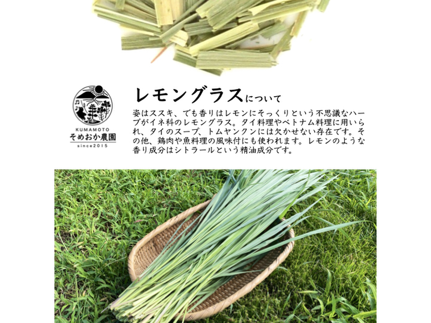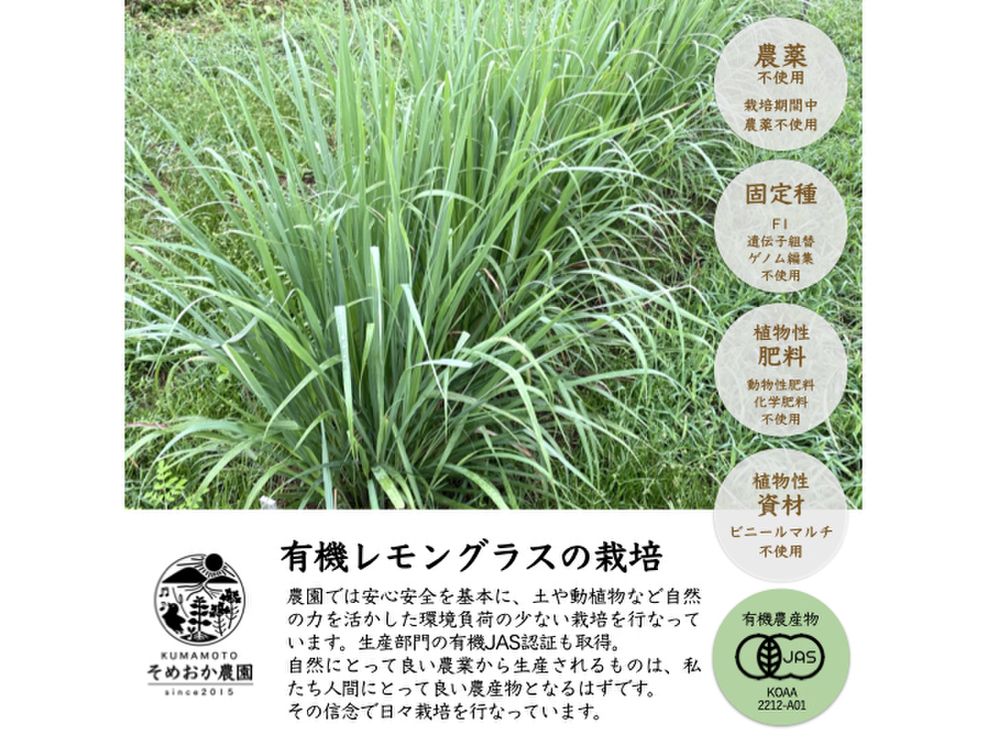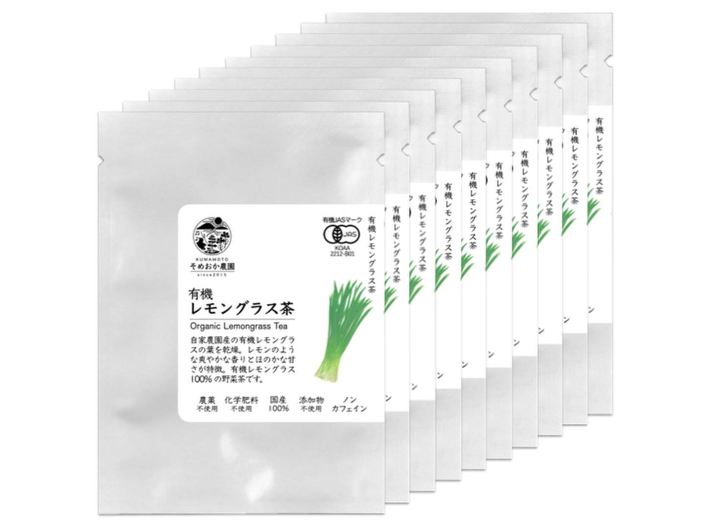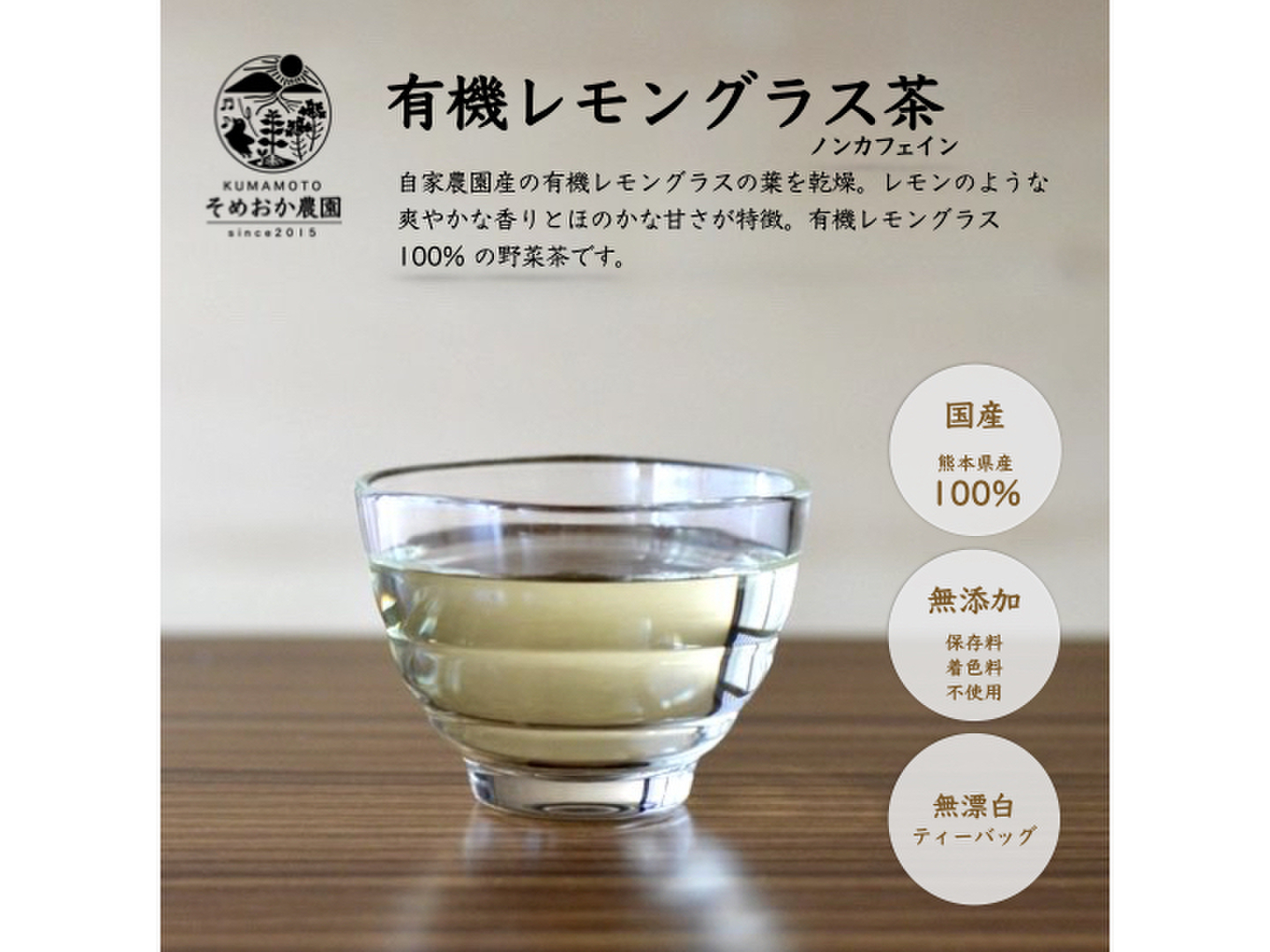 自家農園産の有機レモングラスの葉を乾燥。レモンのような爽やかな香りとほのかな甘さが特徴。有機レモングラス100% の野菜茶です。