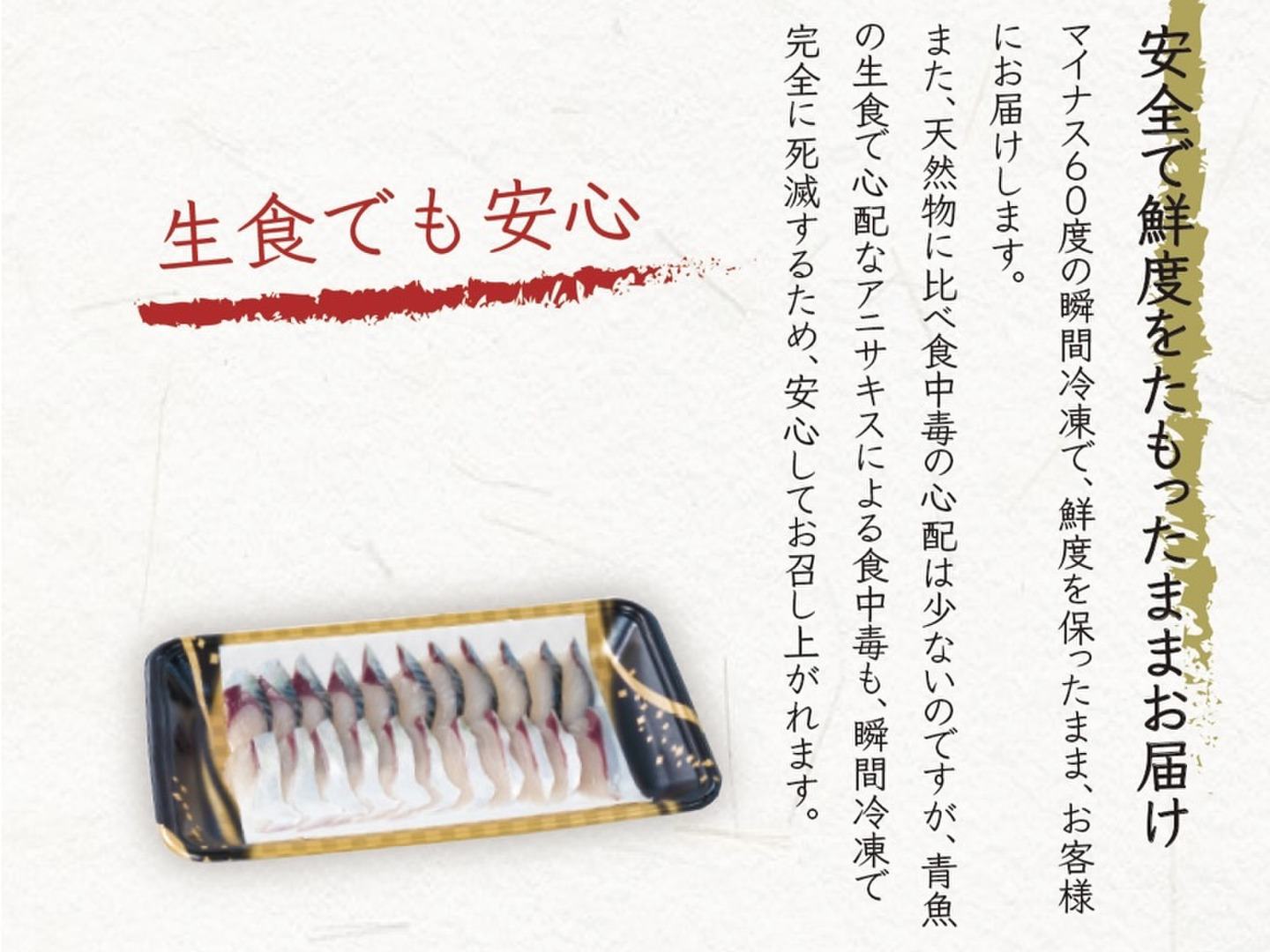 ※もともと長崎ハーブ鯖は寄生虫(アニサキス)が殆ど見受けられたことがなく安心して生で食べていただける鯖ですが、さらにこちらの商品はマイナス60度のアルコール凍結をしているため、心配なく召し上がっていただけます。