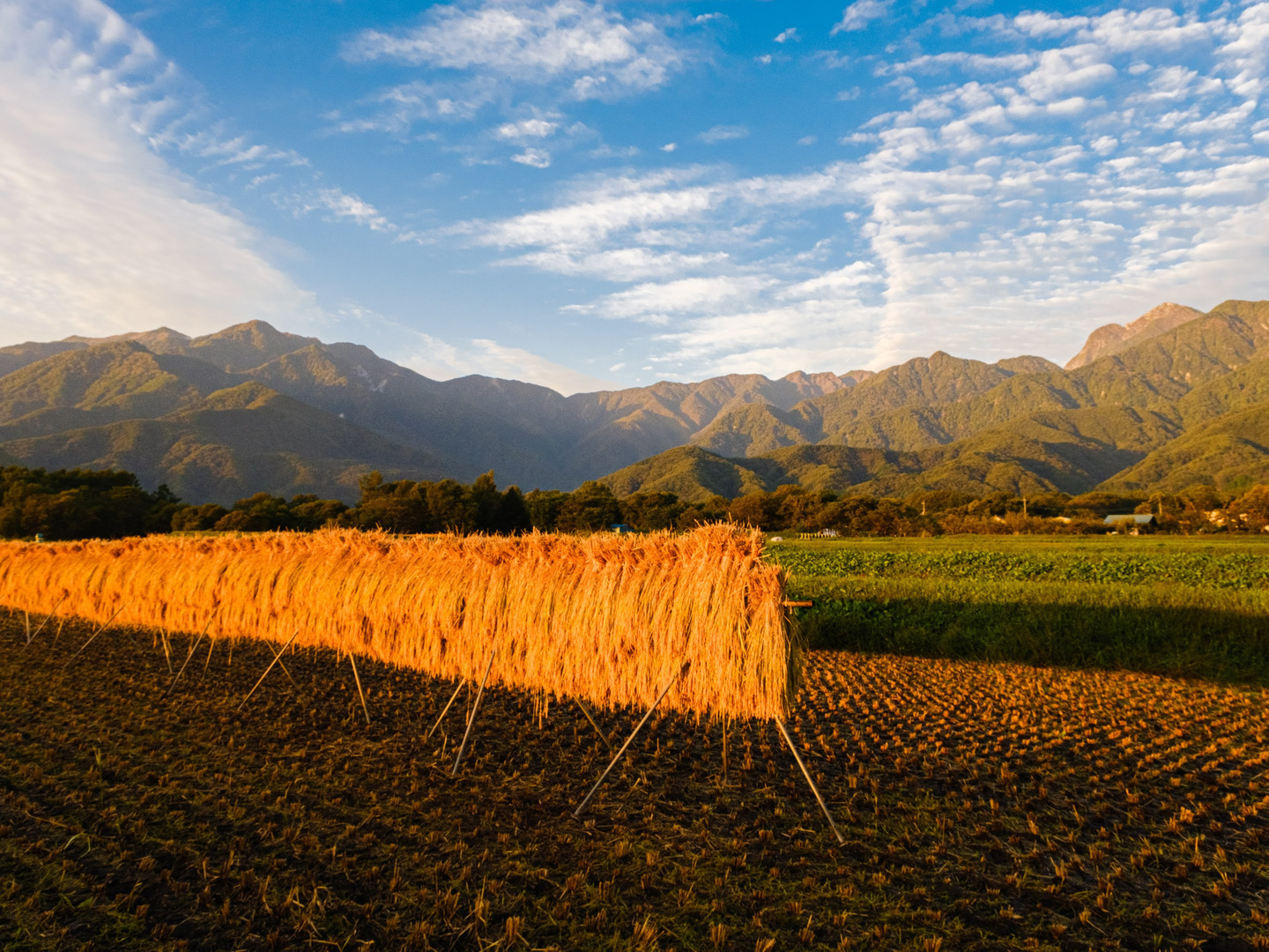 稲をハゼ掛け天日干し