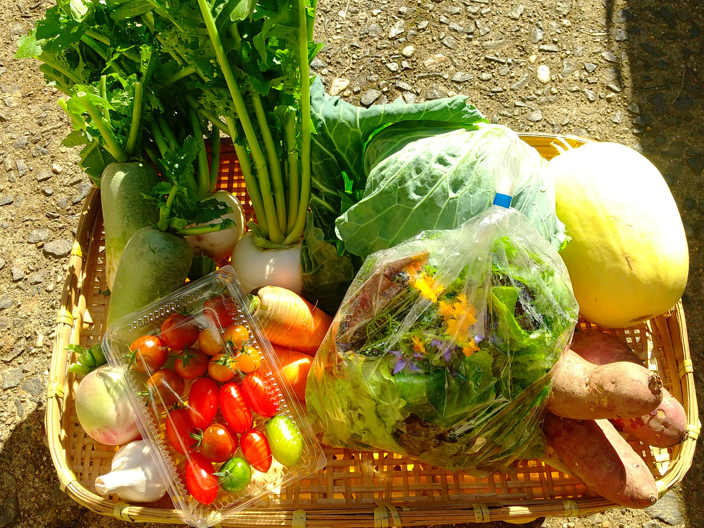 キャベツ、カブ、葉付きミニニンジン、紅芯大根、サラダ野菜、さつまいも、ビタミン大根、サラダ大根、ミニトマト、菊芋、いづれか8~9品
