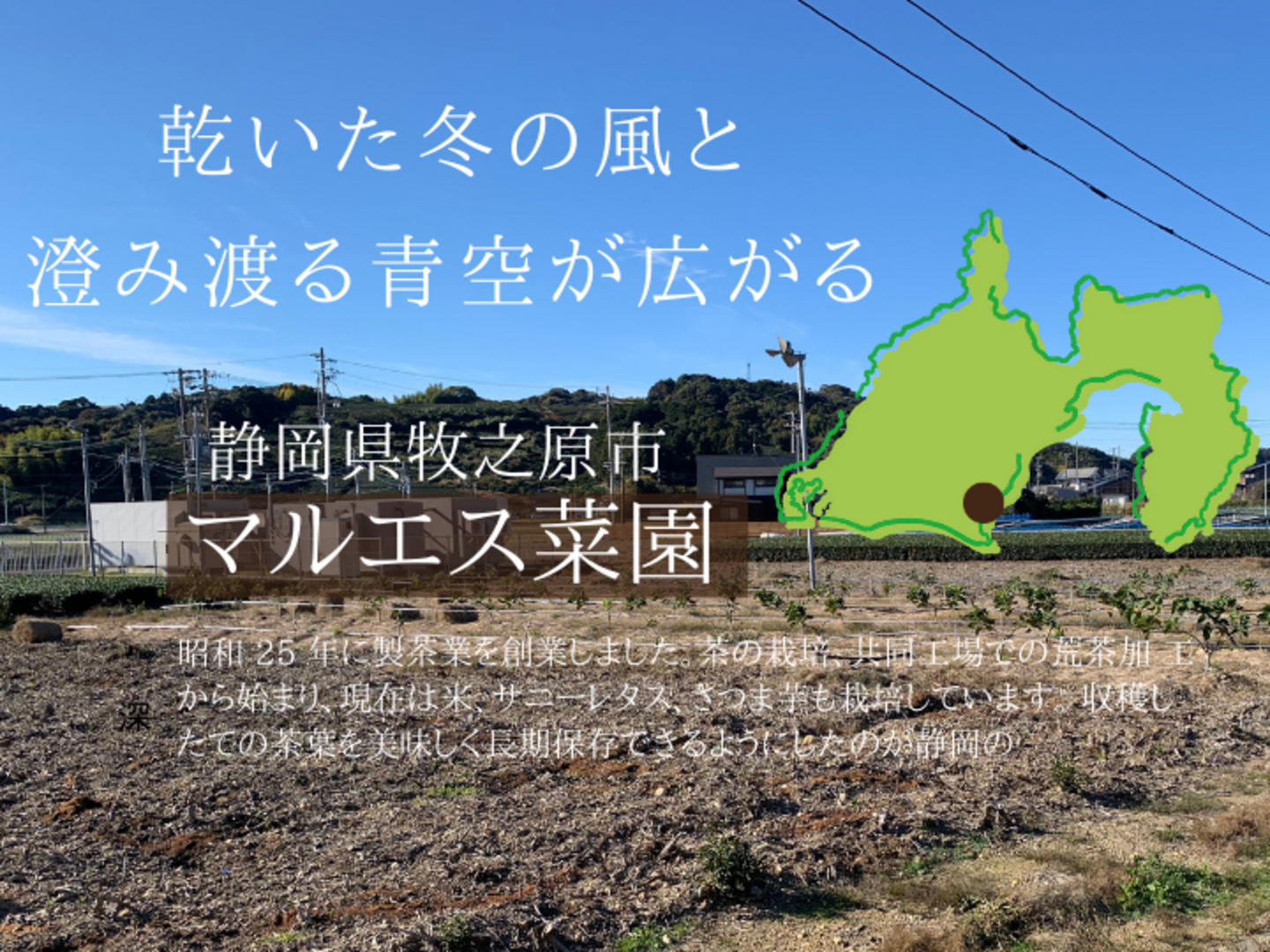静岡県西部、牧之原市は、冬になると遠くの山々を越えてきた乾燥した強い風「遠州のからっ風」が吹きます。また、太平洋気候なので、雲ひとつない青空が広がり、雨はほとんどありません。そんな気候は、干し芋づくりにまさに理想的なものです。