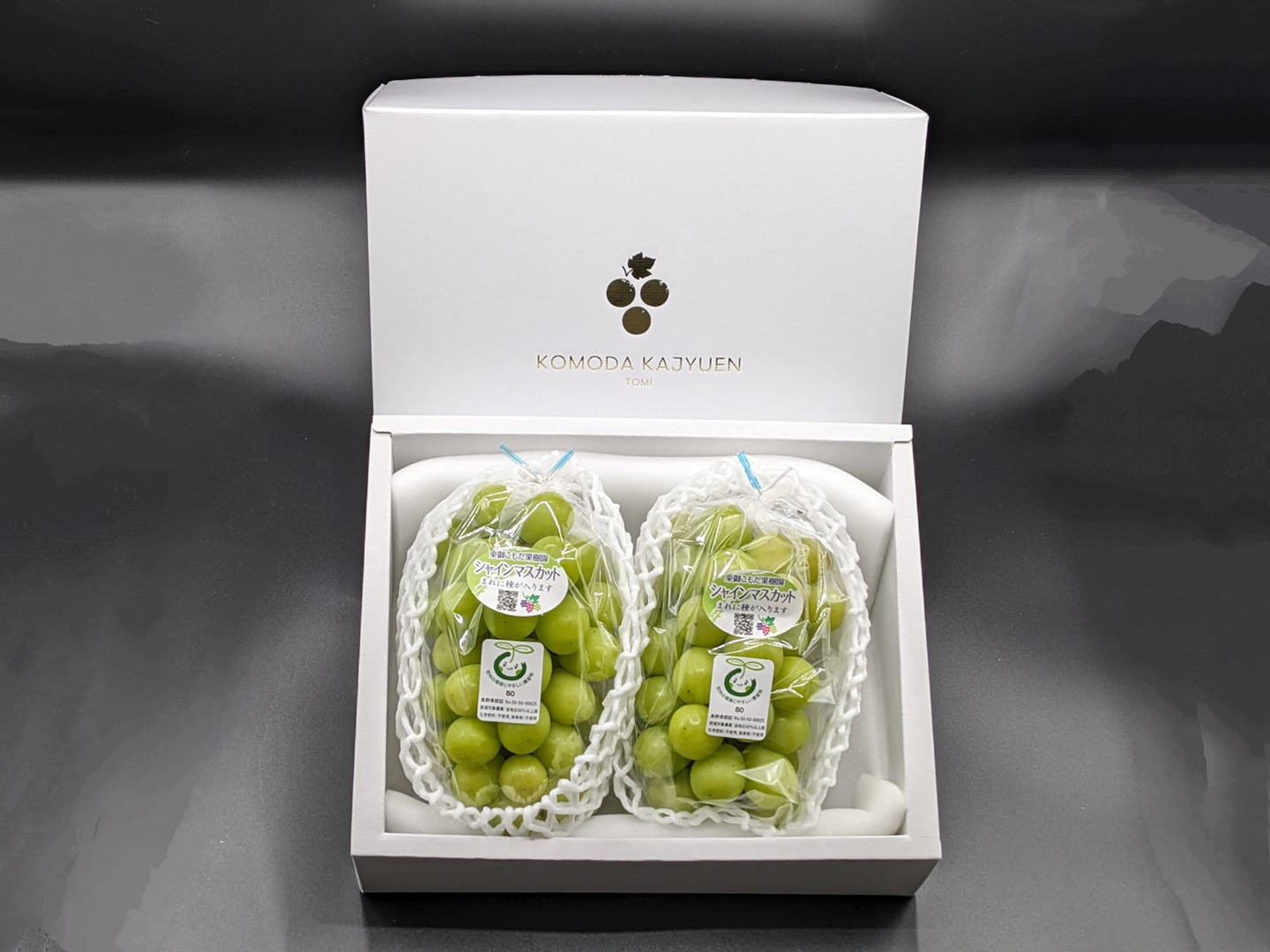① ラグジュアリー: 収穫したぶどうの中から、一房の重さが700g以上という基準に加え、房の形、粒の揃い、色づき、糖度のすべてが卓越したものだけを厳選。約1,000房に1房しか出会えない、唯一無二の最上級果実を、当園オリジナルの最高級貼り箱に詰め、心を込めてお届けいたします。