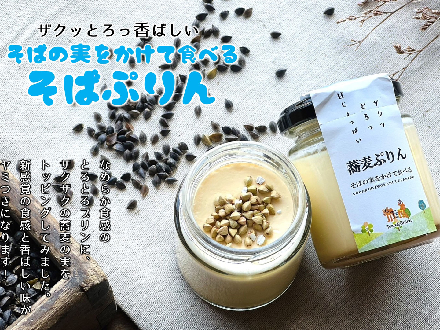 なめらか食感のとろとろプリンに、ザクザクの蕎麦の実と塩をちょこっとトッピングしました。そばの実をリピートしたくなるほどヤミつきになる人も。