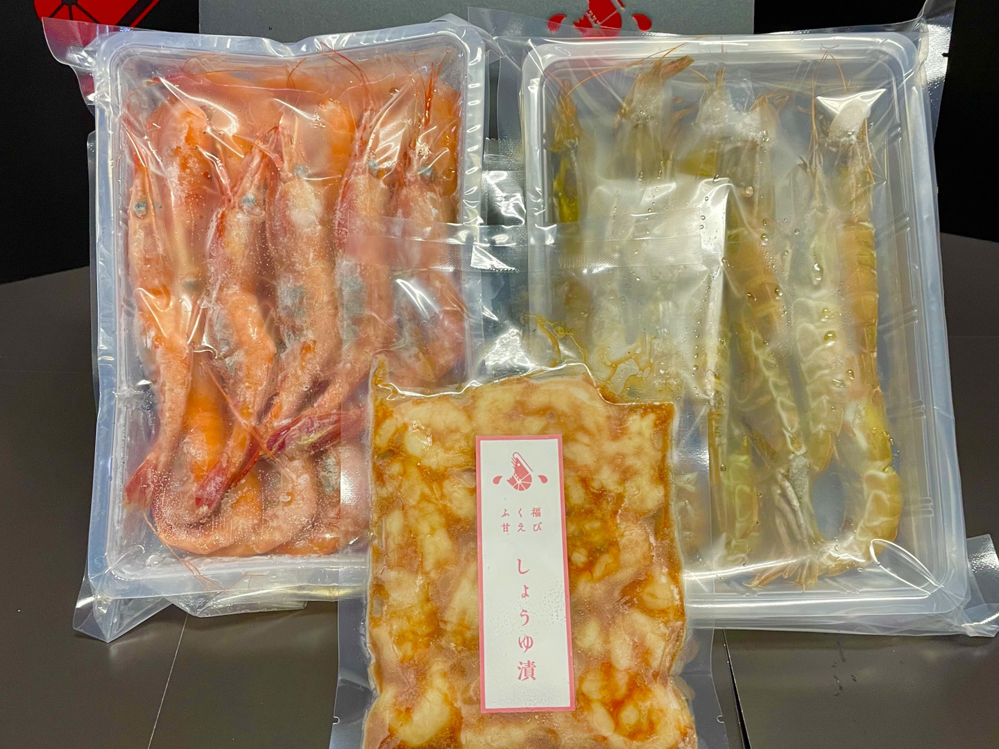 【冬ギフト】🌟コンクール入賞🌟 忙しい毎日の夕食に殻むきの手間なし!ちょっと贅沢だけど、すぐに食卓に!ふく福甘えび[味付け剥き身甘えび三種]そのまま+醤油漬け+生姜漬け 各120g約60匹 (箱なし)