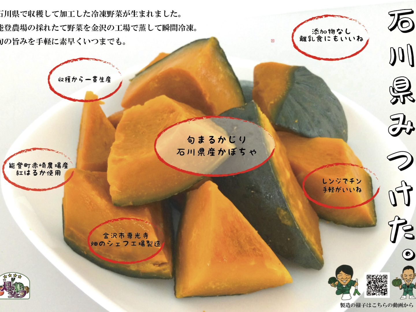 収穫から加工まですべて安心安全の自社製造。オール石川県でつくった冷凍かぼちゃはいかがですか?