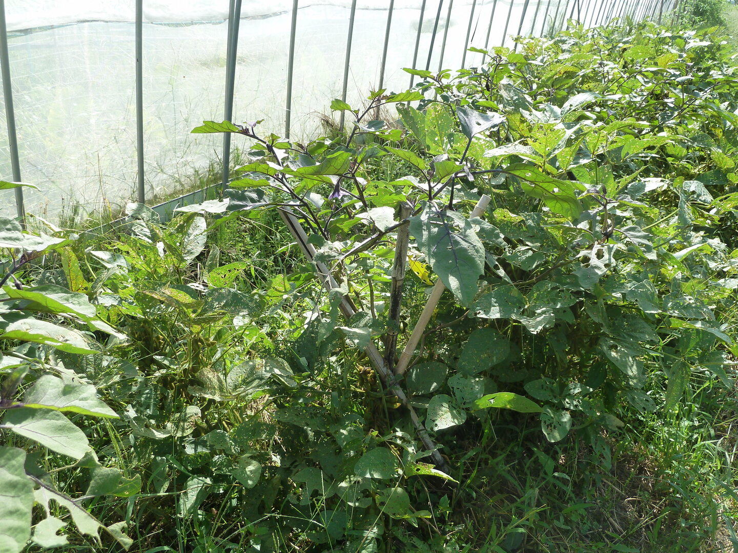 各種の露地野菜と混植共生栽培(写真は茄子との混植)し、枝豆としても出荷してきました大豆。栽培希少品種の「借金なし大豆」です。ひと莢づつ収穫し、天日乾燥して、莢からはずして、乾燥豆として出荷いたします。