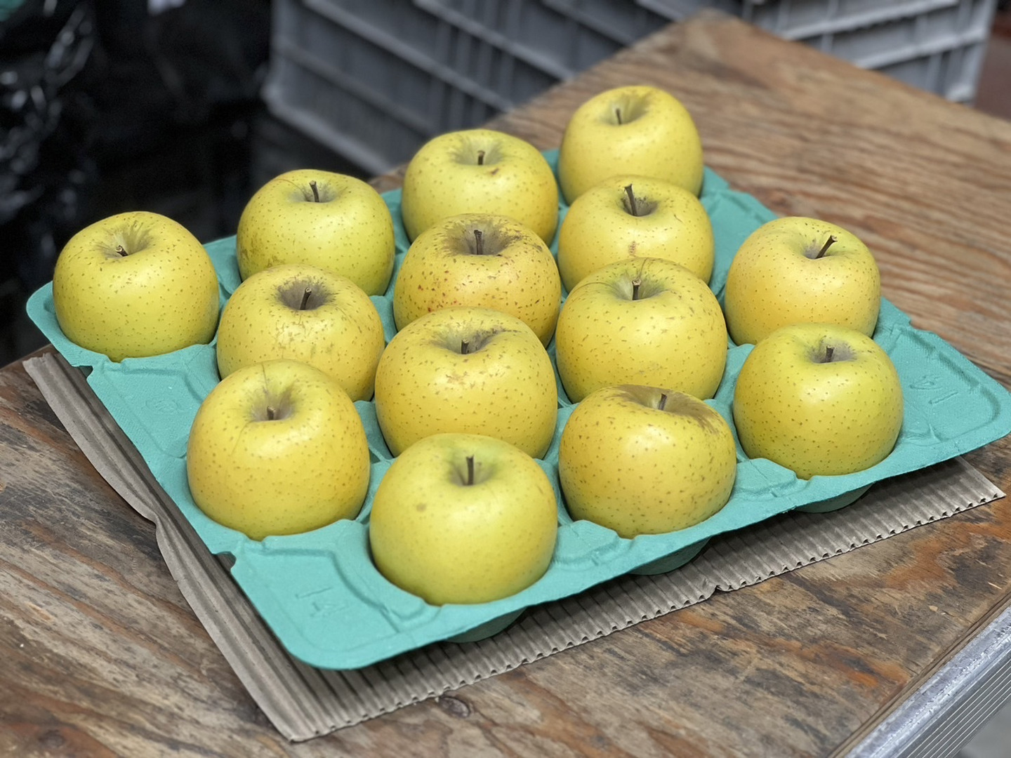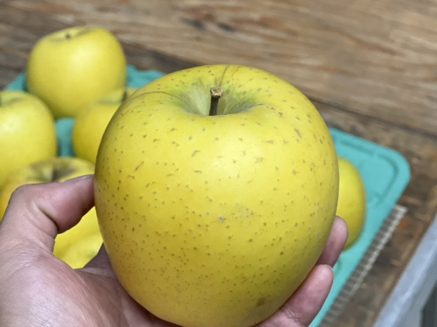名前の通り黄色「ゴールド」に着色し、りんごの見た目を覆すほど綺麗な黄色をしております。こちらもシナノスイート同様、県内だけではなく海外生産者にまで人気となっております。とにかくシャキシャキとした果肉が特徴であり、味はスッキリとしており酸味が程よく、私事ながら当農園生産品種では従業員に一番人気の品種です。