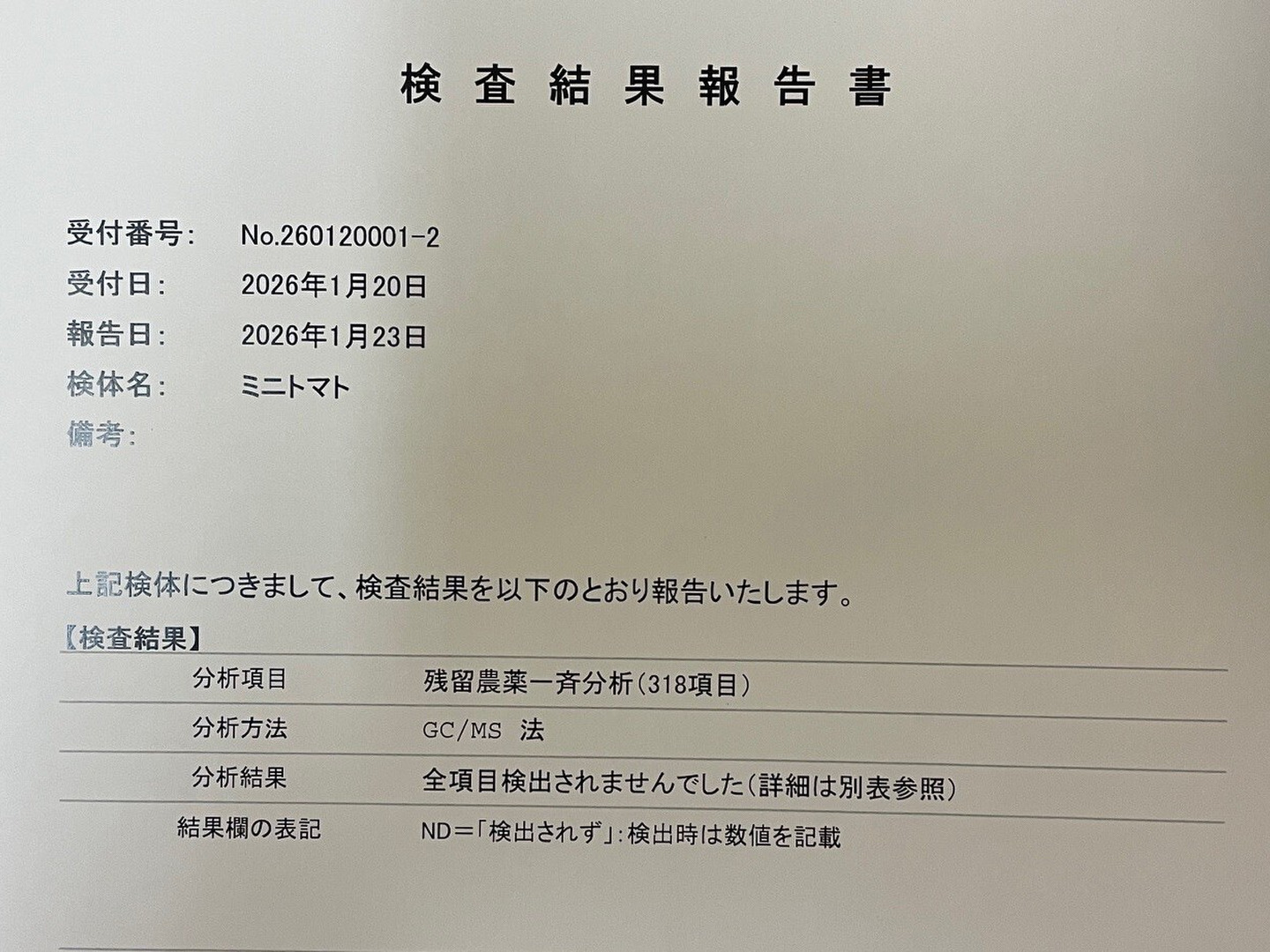 残留農薬検査を毎年実施し、農薬不検出の『残留農薬ゼロトマト』は、各方面の料理人や健康志向の高いユーザーから高く評価され、口コミで広がりつつあります。