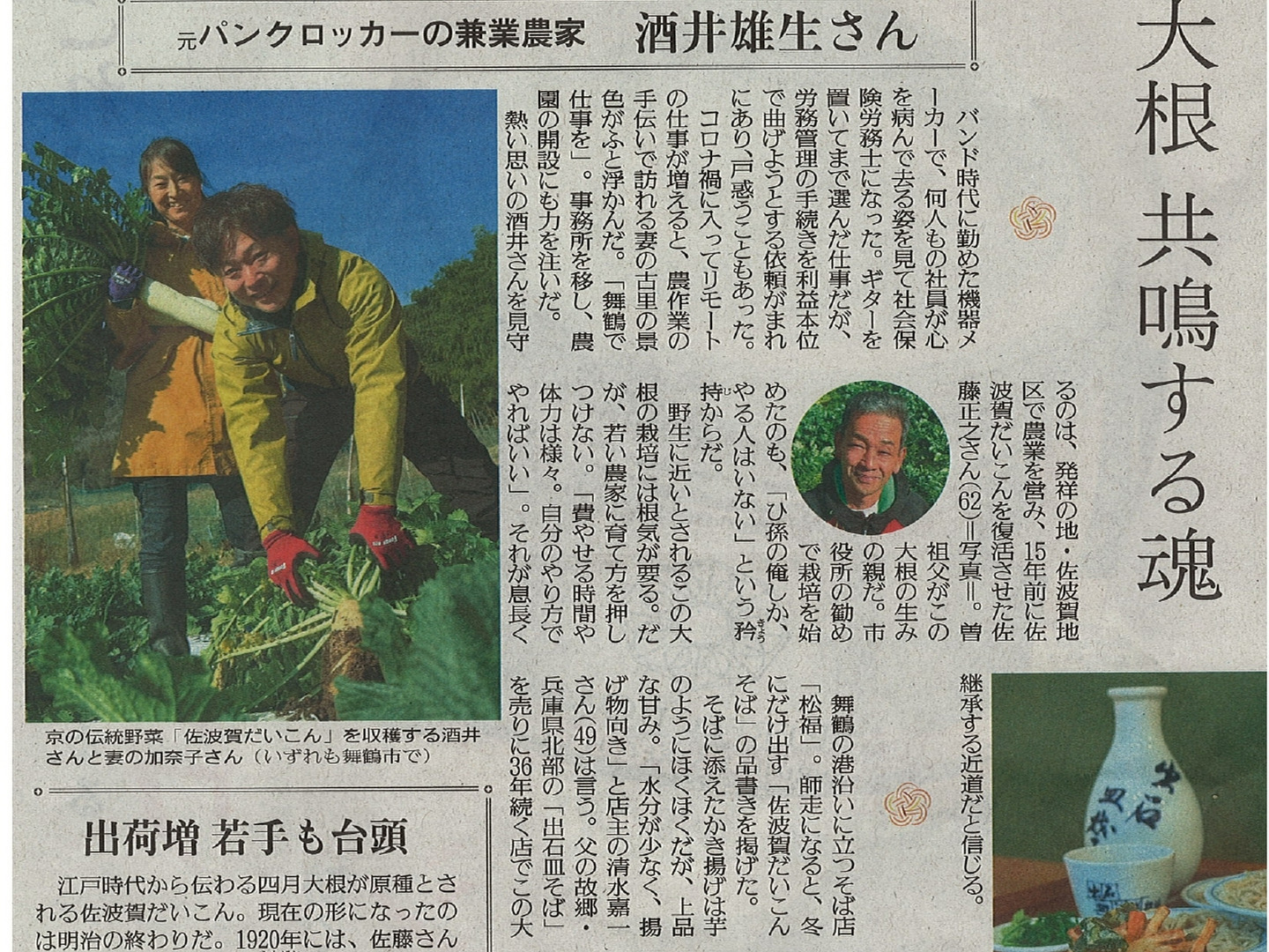 写真に載せているのは、佐波賀だいこんの身と葉と人参のかき揚げです。水分が少ないため、信じられないくらいホクホクします。