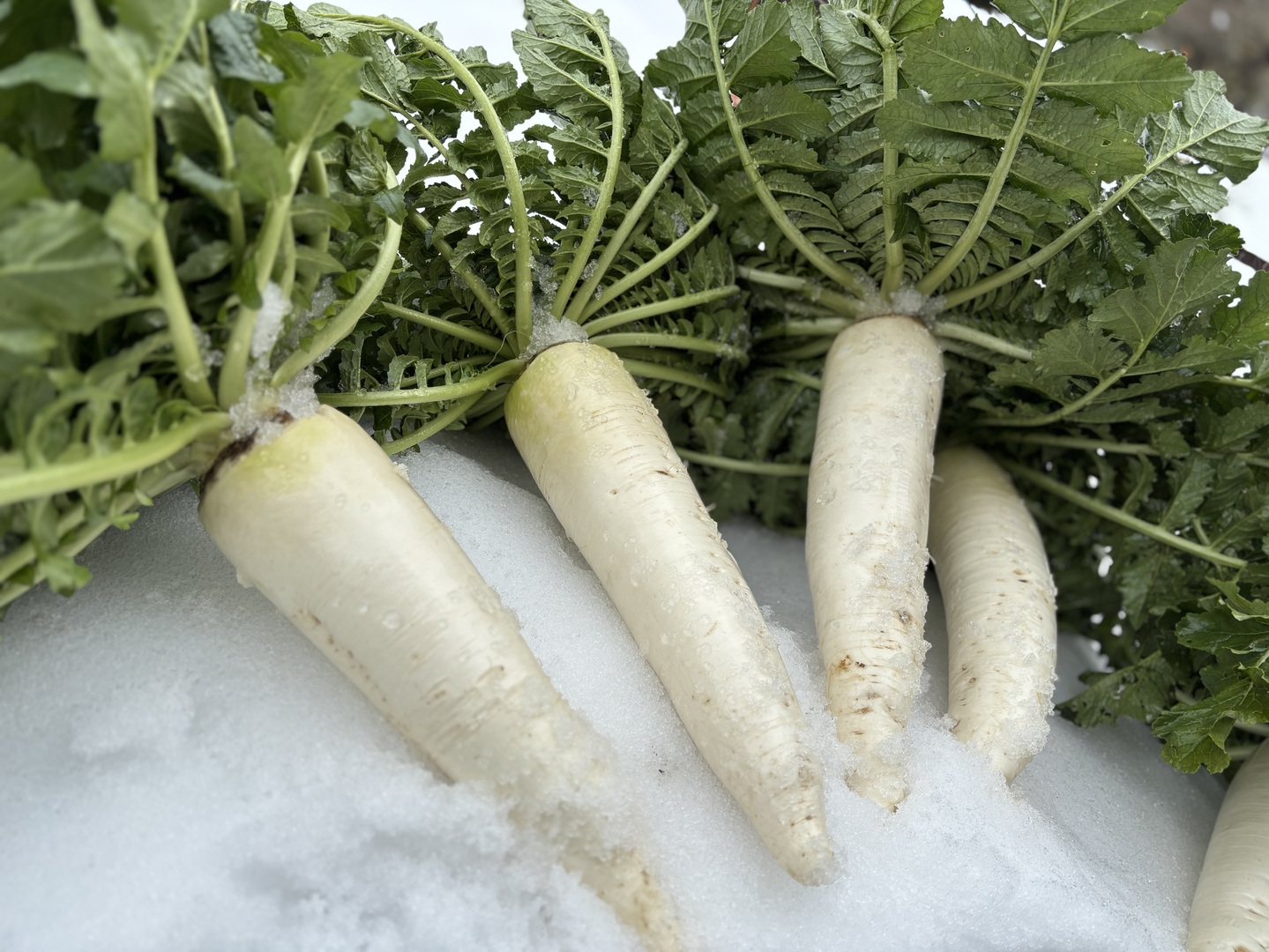 佐波賀だいこんは通常のだいこんに比べてとても晩成で、厳寒の冬場に土の中でゆっくり育つため、身が引き締まってずっしりと重く、水分の少ないしっかりとした肉質が特徴です。