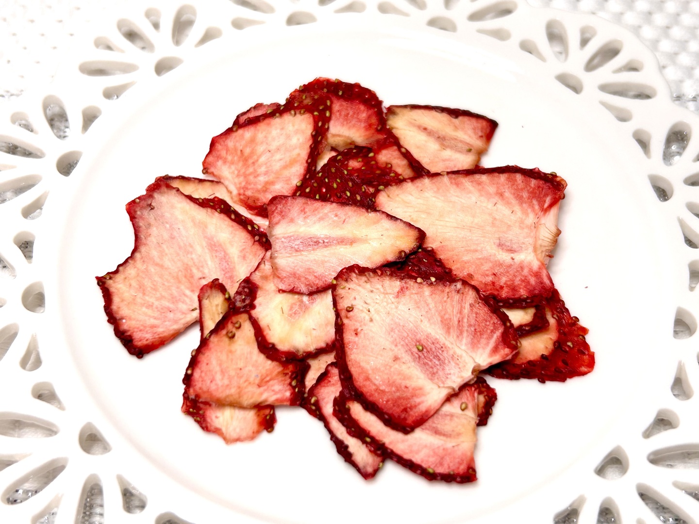 完熟の新鮮ないちごをきれいに洗浄し、スライスして乾燥させ、出来立てをそのまますぐ真空包装しています。