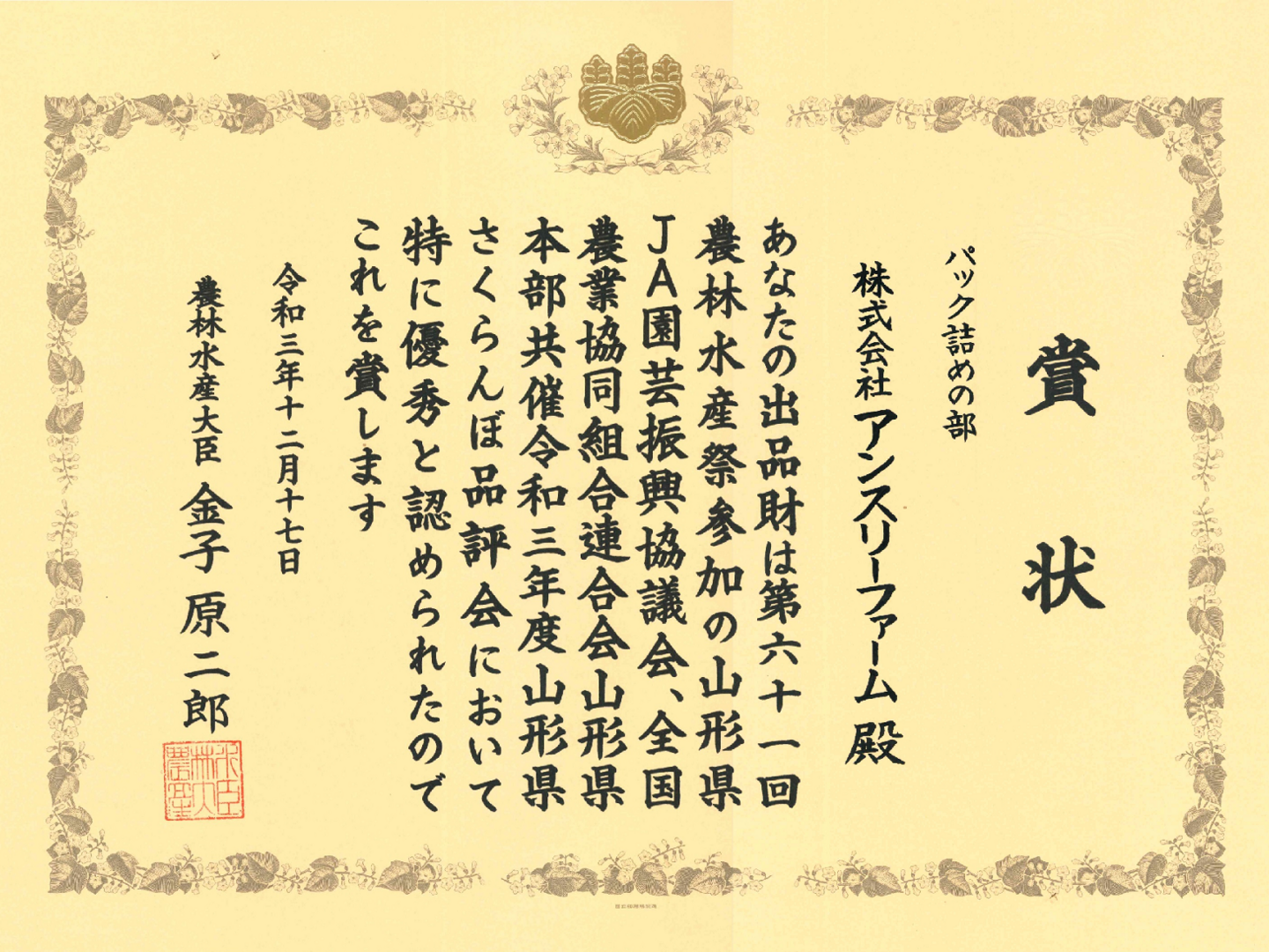 - 山形県さくらんぼ品評会で山形県1位!農林水産大臣賞を受賞!
