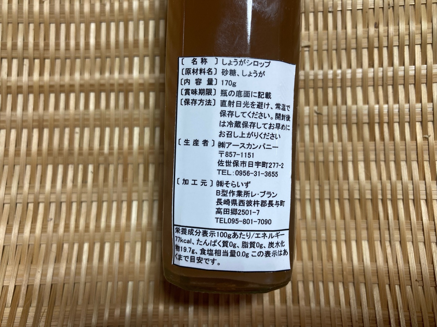 生姜シロップ(170㎖)につきましては、生姜・水・三温糖のみを使用しており添加物や他での味付けは一切行っておりません。