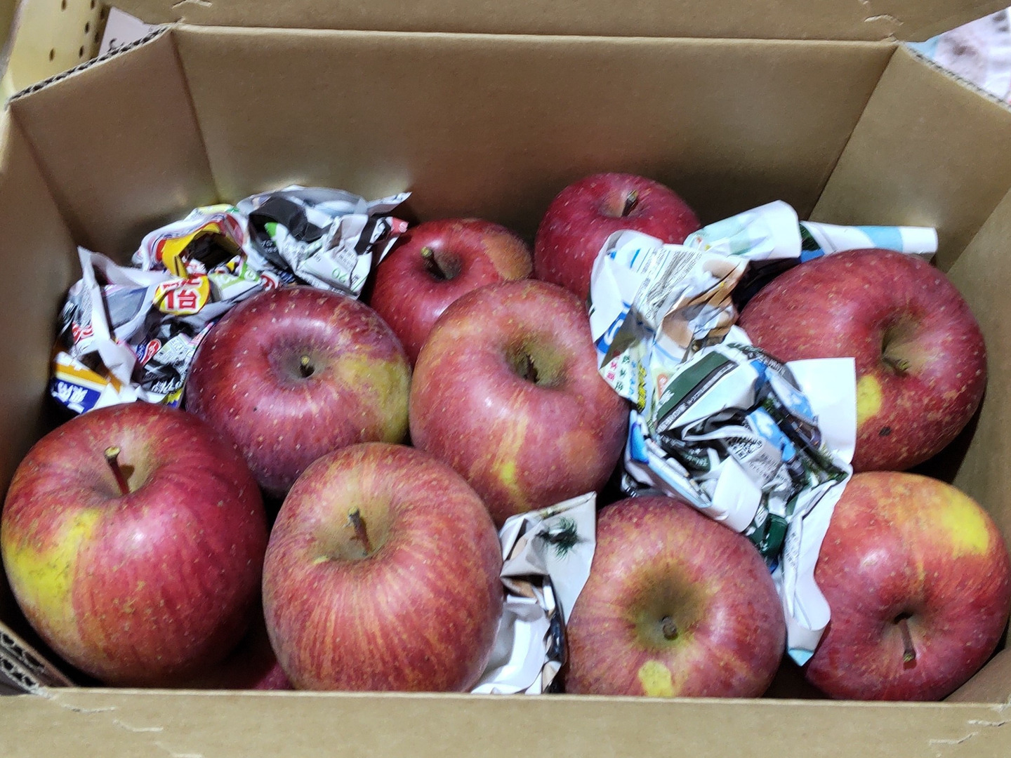 緩衝材というか、りんごがゴロゴロ動かないように新聞紙を適宜詰める程度(画像参照)ですので、運送時の荷扱いによって多少の打ち痕ができる可能性はご了承ください。
