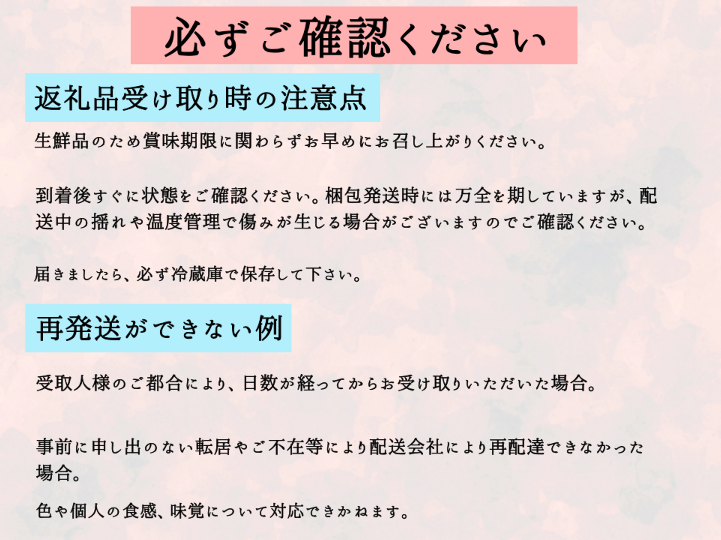 ※お客様のご都合により商品を受け取れなかった場合、または受け取りまでに期間がかかった場合は生鮮品につき返品・再発送はいたしかねますので予めご了承ください。