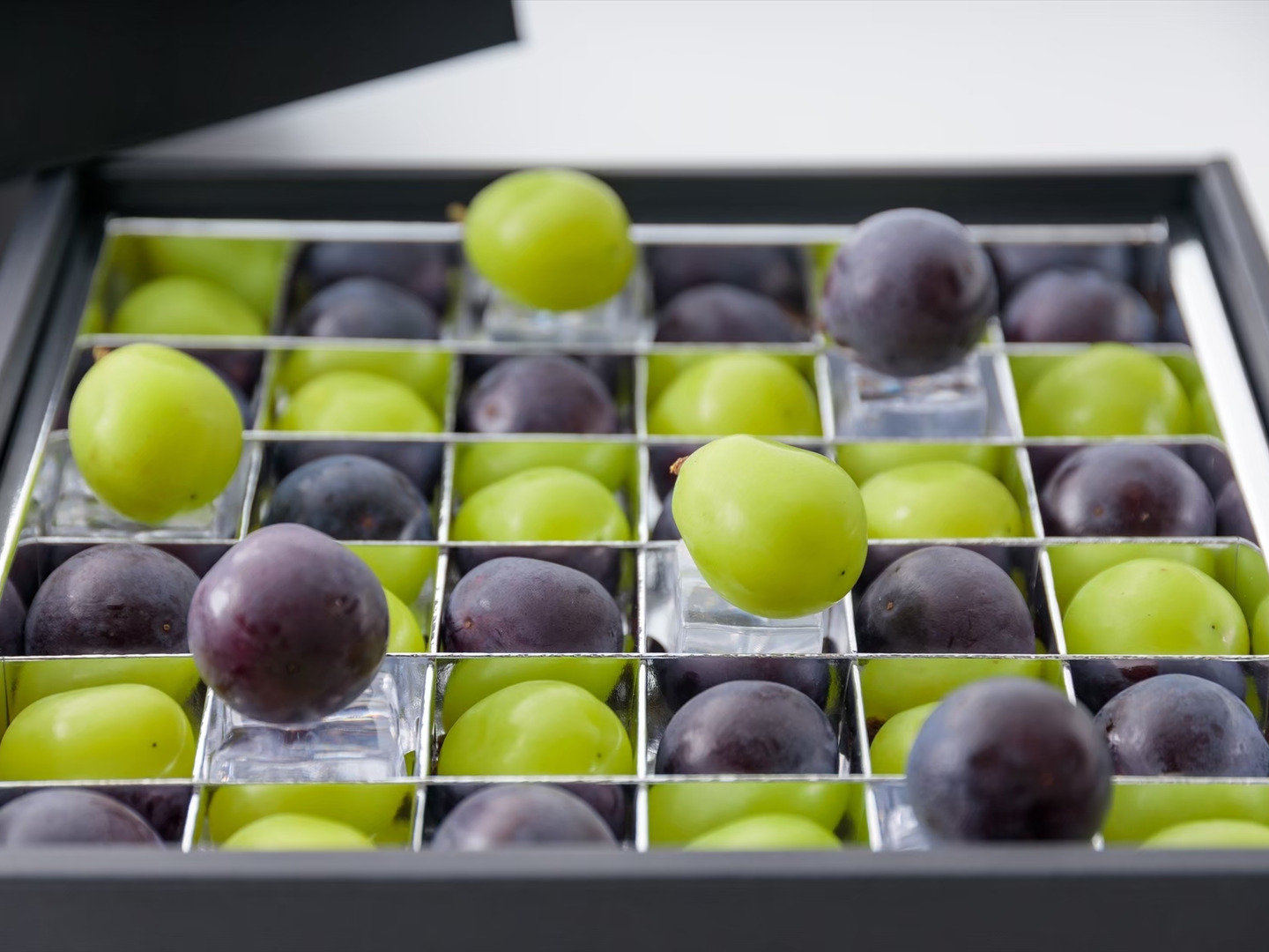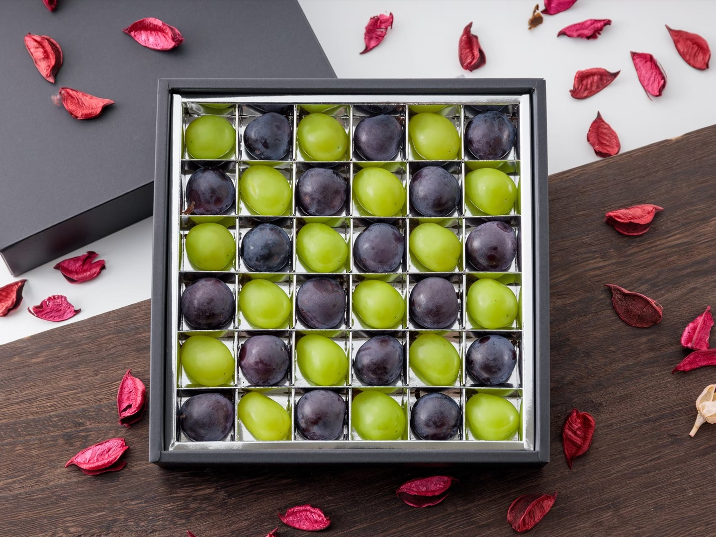 シャインマスカットとニューピオーネ又はオーロラブラックを宝石箱に詰めました。一粒14g以上を36粒。