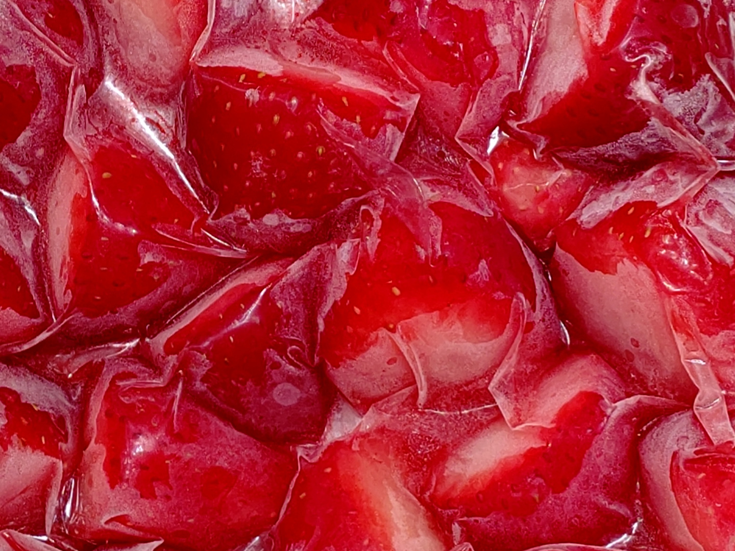 朝摘みの新鮮な完熟いちごをきれいに洗浄し、ヘタを取って真空パックに詰め、-19℃で冷凍しました。