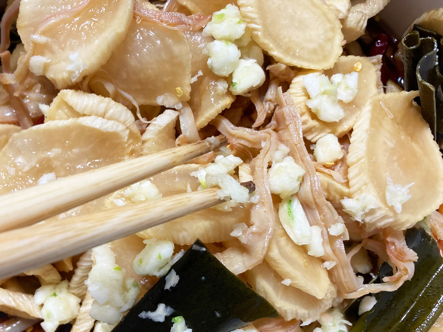 北海道産のイカと昆布、青森産の唐辛子とニンニクが