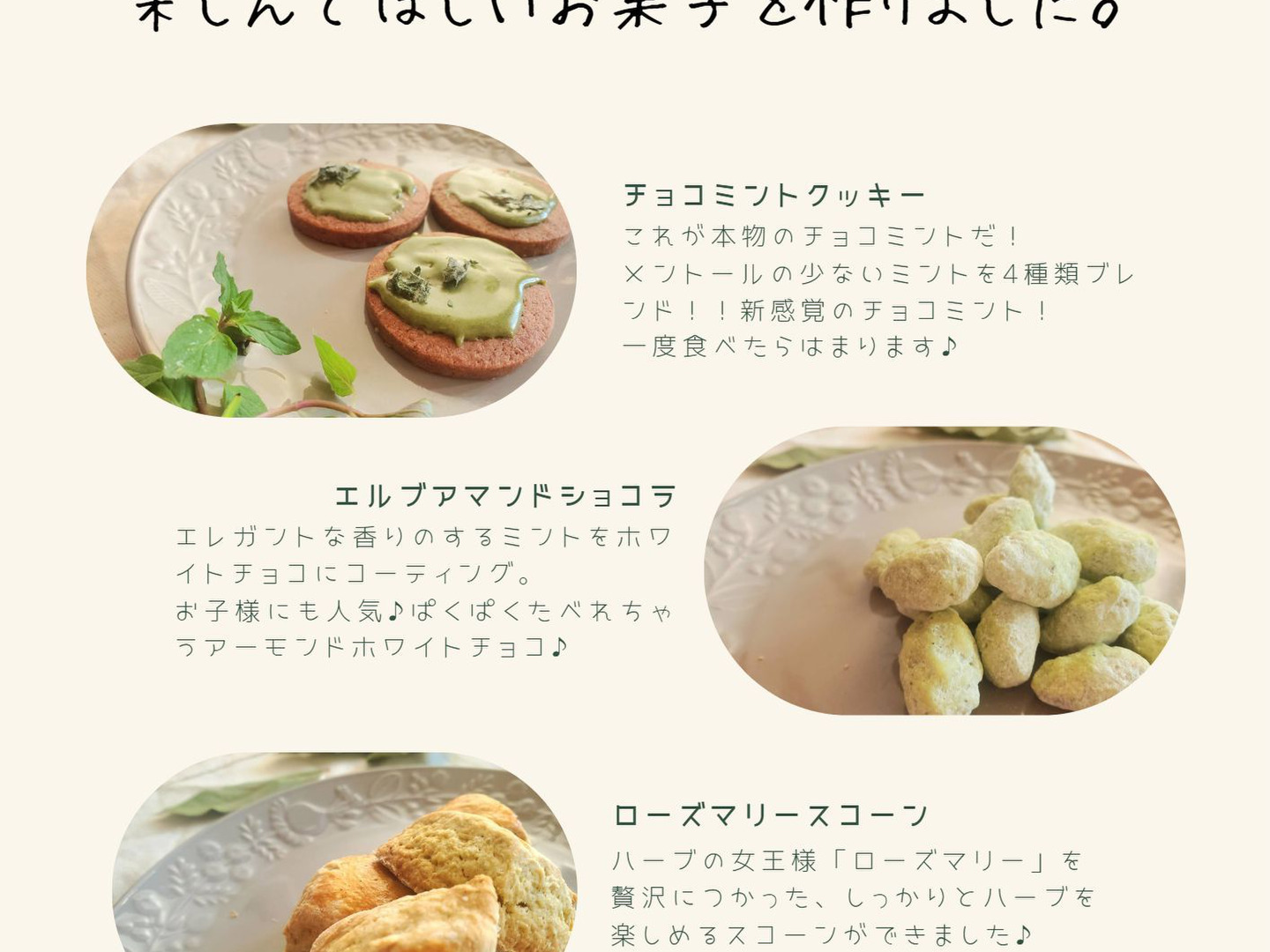 ドライフルーツ 小袋×3個、チョコミントクッキー×3個、エルブアマンドショコラ 40g、ローズマリースコーン 4個