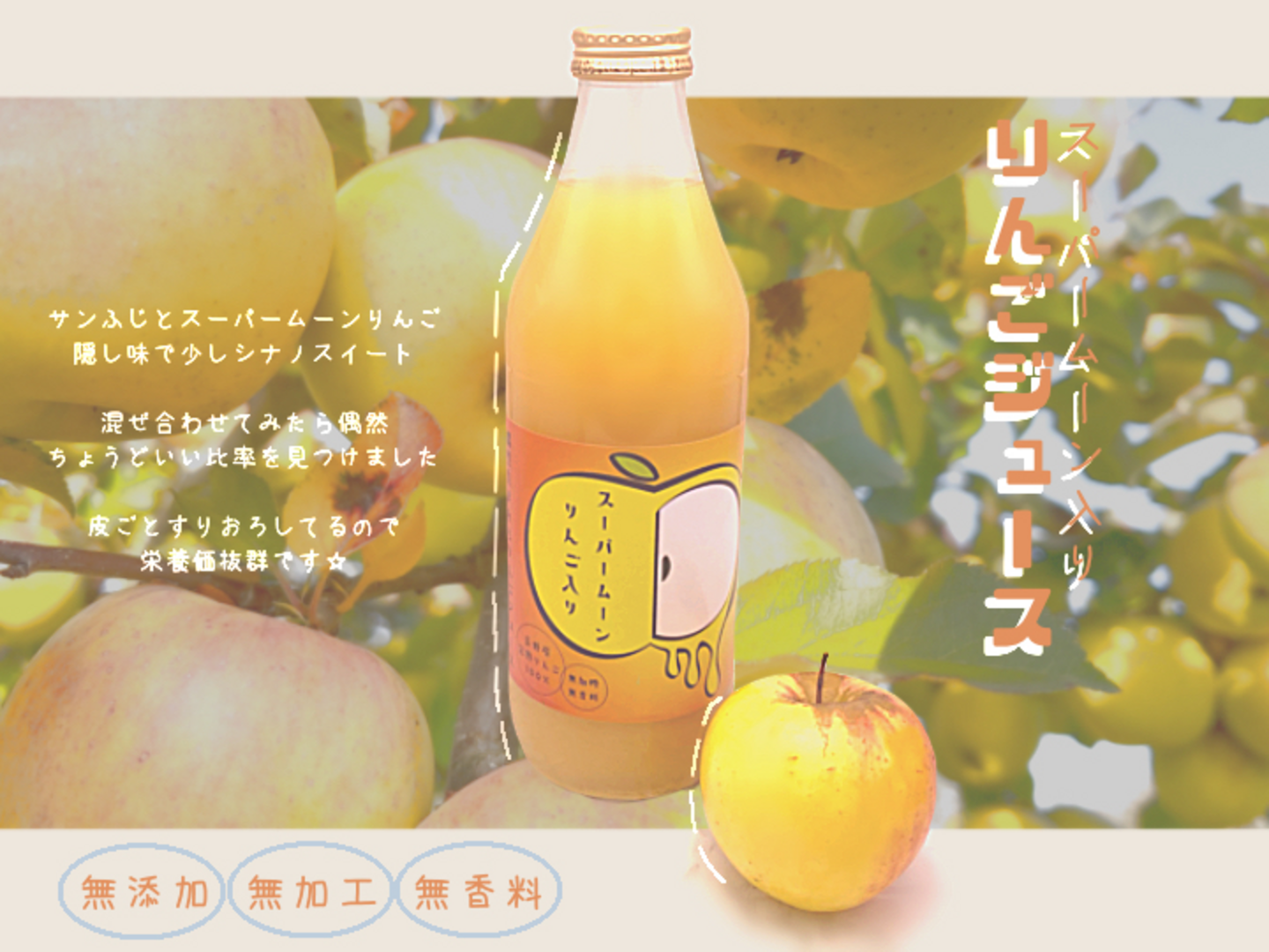 おおぐし農園2の商品である「サンふじ」と「スーパームーンりんご」隠し味で少し「シナノスイート」を皮ごとすりおろして混ぜ合わせてみたら、偶然ちょうどいい比率を発見しました☆その名も「偶然生まれたりんごジュース」。1本のりんごジュースには約8個分の完熟りんごを贅沢に使用しています♪