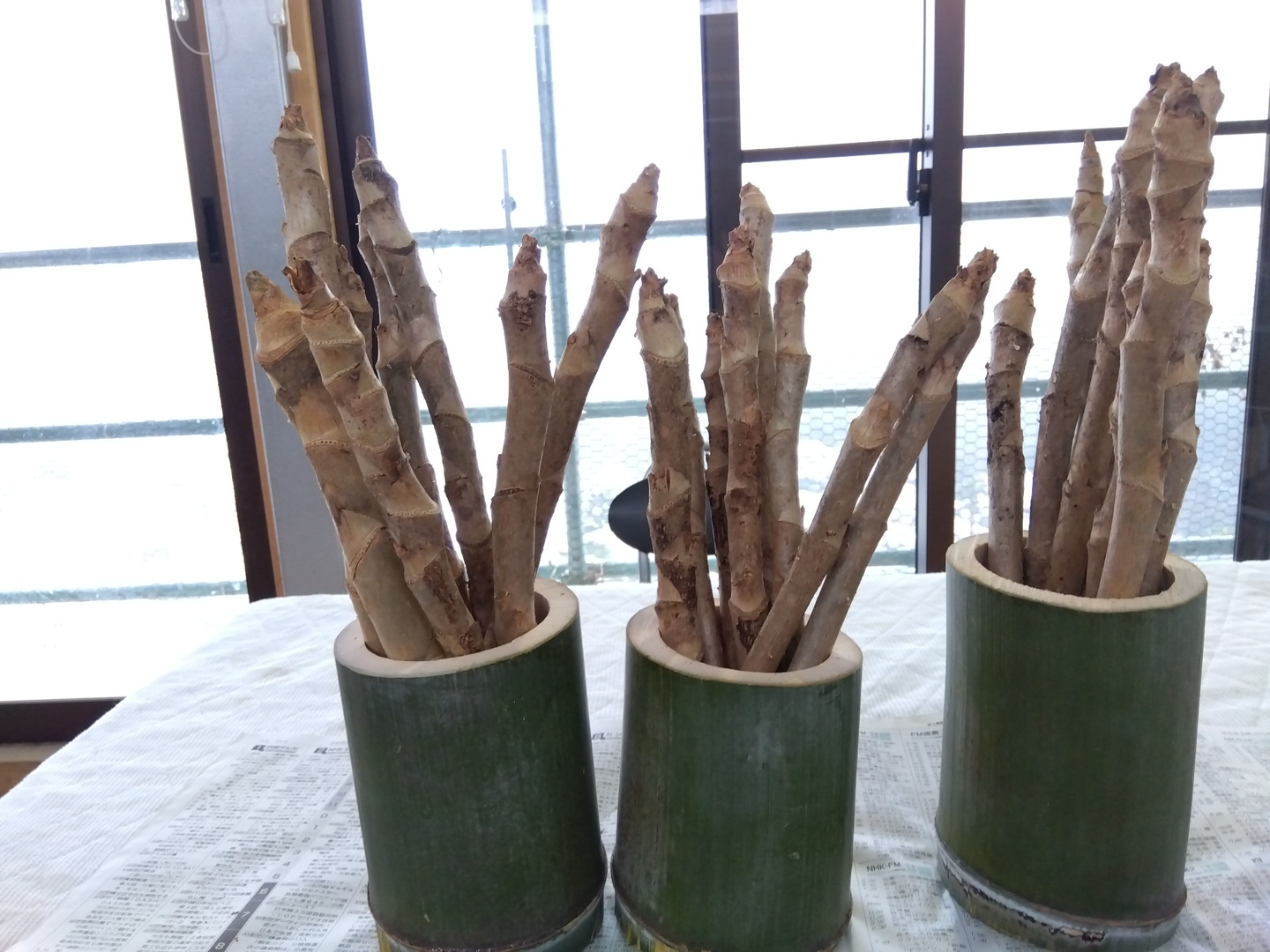 今年も残り3セット限りとなりました。 『激レア』 タラの芽の原木8本と手作り竹花瓶のセット 春を一足先に告げる南国の木の芽です
