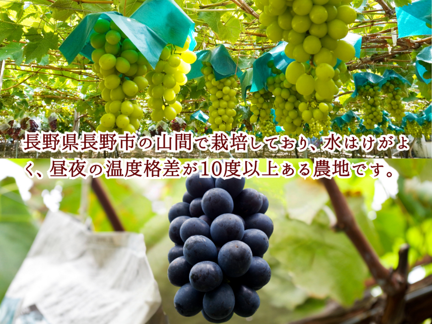長野県長野市の山間で栽培しており、水はけがよく、昼夜の温度格差が10度以上ある農地です。高糖度なぶどうを栽培するのに最も適した環境で栽培しております。ぶどうの木に水は必要ですが、吸収する水が少ないほどより一層果実が甘くなる性質があります。また、温度格差によりぶどうの夜間の呼吸を抑制します。無駄なエネルギーが抑えられ、より甘いぶどうが栽培できます。さらに、私たちの農園では完熟し甘くなったタイミングで収穫しております。より糖度が高いぶどうを栽培することにこだわっています。