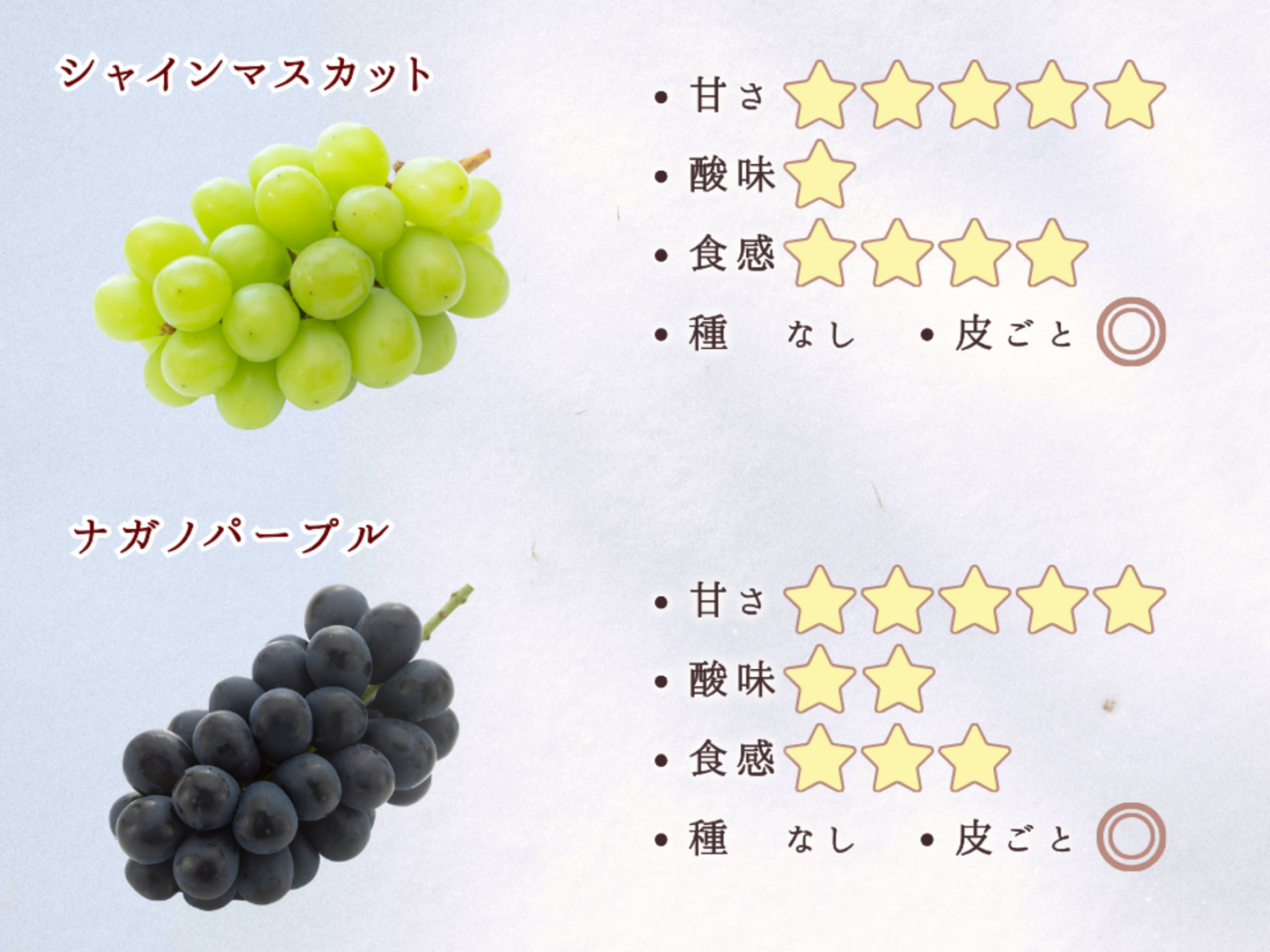 ナガノパープルの甘みが強く酸味はおだやか、果汁たっぷりで豊かな風味と、シャインマスカットのパリッとした食感と甘さの中にある程よい酸味を一緒にご堪能ください。