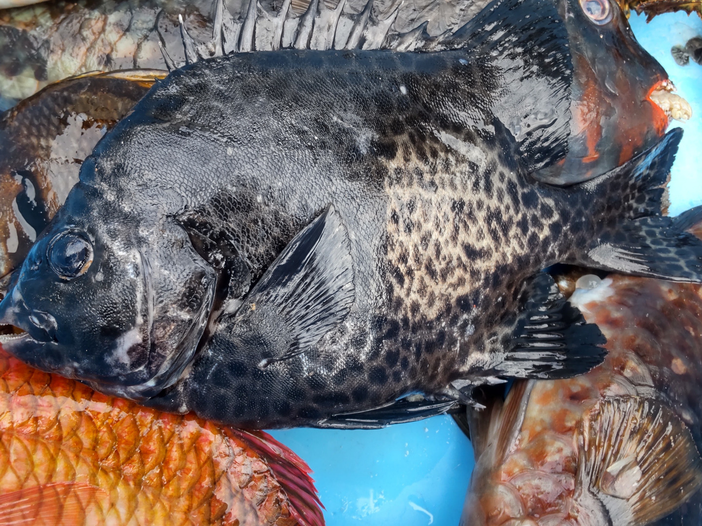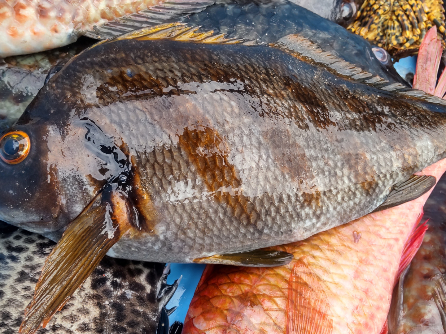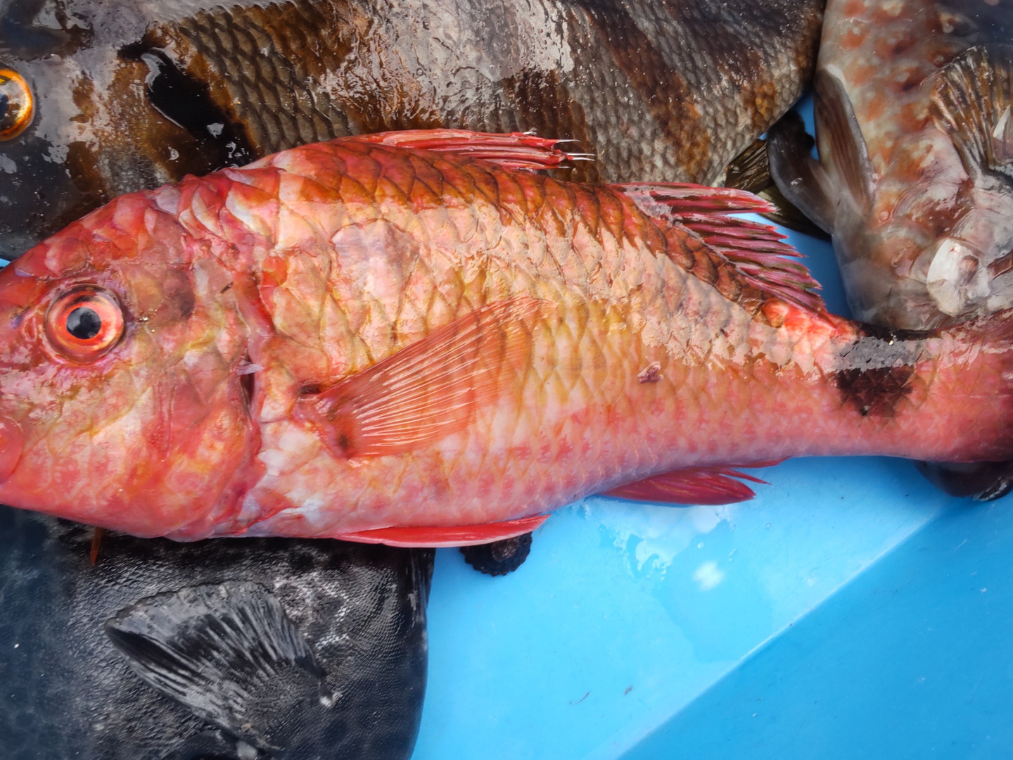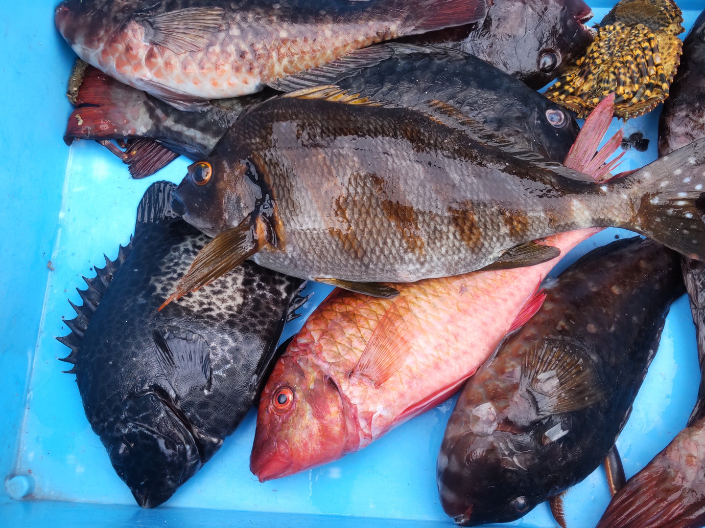 ブダイの他にも小さいイシガキダイやタカノハダイ、オキナヒメジなどがとれますので、色々な魚をミックスしてお送りします。