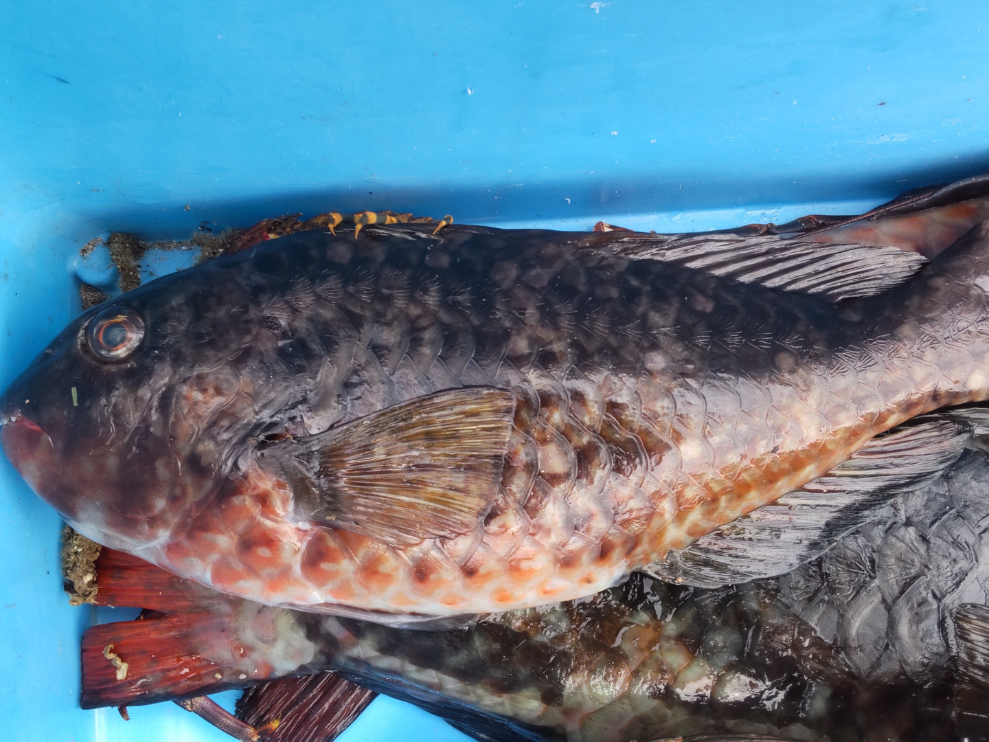 イセエビ漁の網にはイセエビだけでなく魚もかかります。その多くは市場に出しても値段がつかない、いわゆる未利用魚です。ブダイなどは自分たちで食べたりもしますが、近年網にかかる量が増えてきて処理しきれないのが現状です。また、ブダイは海藻を好んで食べる魚で、磯焼けの原因ではないかとされています。実際、私達の地区の海域でも磯焼けが進行し、貝類の水揚げが減っており、隣の地区ではこのブタイを駆除目的で捕獲しています。