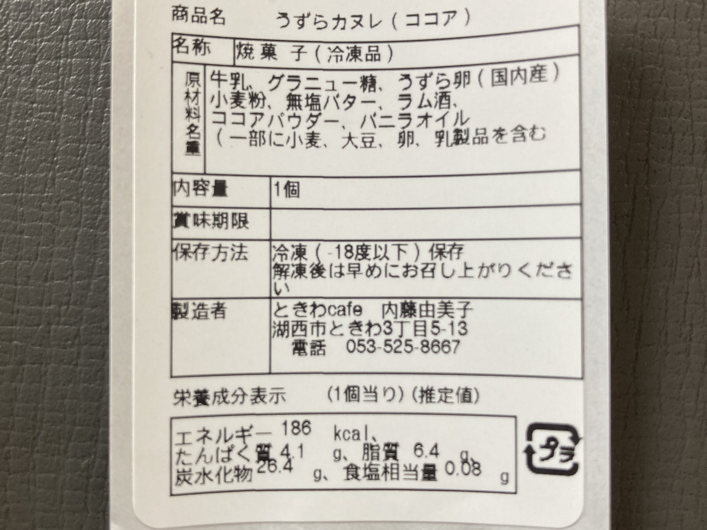 商品について あわせ買い対象 同生産者の別の「あわせ買い対象」商品と一緒にご注文いただくと、送料をまとめてお届けできる場合があります。 生産者からのお知らせ ■輸送中の卵の破損について■ごく稀に配送過程で卵が割れることがございますもし破損等がございましたら、最寄りのヤマト運輸さんの営業所に「破損があるので代品をお願いしたい」旨ご連絡ください。破損した卵は捨てたり、食べたりせず、ヤマトのドライバーさんが回収に伺いますので、それまで一時的に割れた卵と入っていた箱は保管しておいて下さい。ヤマト運輸さんからこちらに連絡が入り、代品をお送りするという流れになります。また、ヒビなどの場合には、そちらから優先的にお召し上がり頂いたり、火を通すなどしてお召し上がり頂けば特に品質上では問題なくいただけます。ヒビ等気になる場合にも、上記のようにヤマトさんにその旨お伝えください。 もっと見る 内容 うずらカヌレ 3種セット(バニラ6個ココア3個抹茶3個) 発送 ヤマト運輸(食べチョク特別送料) 送料 ¥ クール便(冷凍) + ¥ 275 数量1点ごとに送料が発生します。 種別 加工品 卵・乳製品 卵 その他卵 産地 静岡県 農薬化学肥料不使用 卵・乳製品 加工品 贈答品 その他卵 静岡県x卵・乳製品 静岡県x加工品 静岡県x卵 静岡県xその他卵 賞味期限 / 保存方法 発送から20日間 冷凍 賞味期限冷凍状態で20日 商品説明 静岡県湖西市の浜名湖ファームです。無投薬飼育でのうずら卵の生産をメインにサツマイモや柑橘類の生産販売を行っています。うずらカヌレは、うずらの腸内環境に着目して実現した無投薬飼育で育てたこだわりのうずらの有精卵を使用しています。外はカリっと、中はもっちり食感が癖になります。大きめサイズでとても食べ応えがあります。《バニラ》はバニラビーンズを使った基本の味です。《ココア》はココアパウダーを使い、お子さまに人気の商品です。《抹茶》はふんだんに抹茶を使用しています。焼立ての良い状態で冷凍し、カリカリ食感を残したままお届けします。お召し上がりの前に冷凍庫から出してすぐ食べれます。※写真はイメージです◇内容◇直径 約5センチ 高さ約5センチ 個包装 6個冷凍品 ◇原材料名◇牛乳、グラニュー糖、うずら卵、小麦粉、ラム酒、バター、バニラビーンズ(一部に卵・乳成分・小麦を含む)解凍後は冷蔵保存の上、お早目にお召し上がりください。時間が経って柔らかくなったカヌレは、オーブントースター等で焼きなおすと、焼立てに近い食感に近付きます(説明書を同封)※発送には最大1週間ほどかかる可能性があります。 もっと見る この商品のことをお友達にもシェアしませんか ポスト シェア