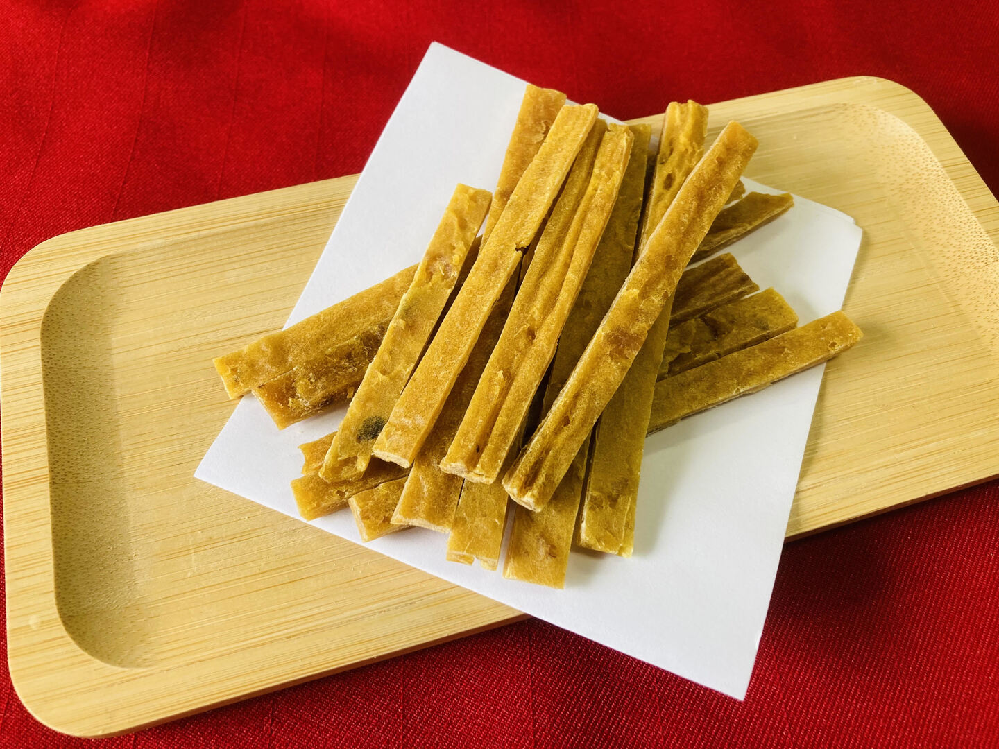 じっくり2時間ほどかけて焼き上げたあと、ひとつひとつ手作業で皮を剥き、”ペースト”にしてから乾燥させ、食べやすいスティック状にカットいたしました。