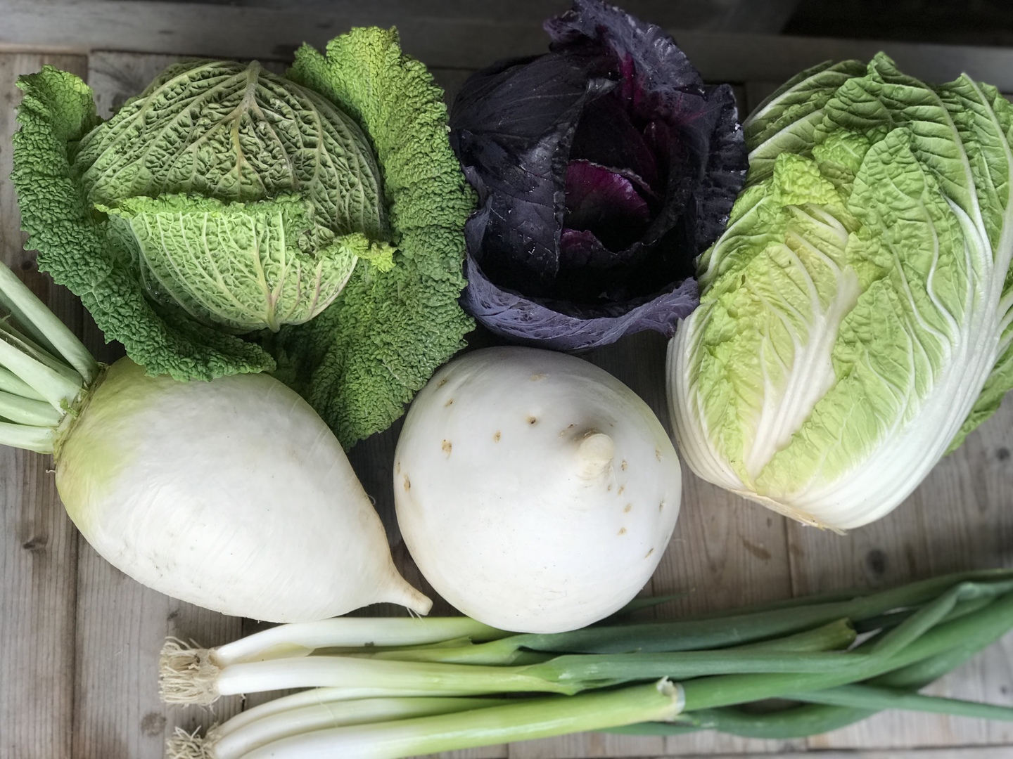 京都産 オレンジクイン白菜1玉、聖護院大根1個、聖護院かぶ1個、シューフリーゼ(ちりめんキャベツ)1玉、レッドキャベツ1玉、鷹峯ネギ300g