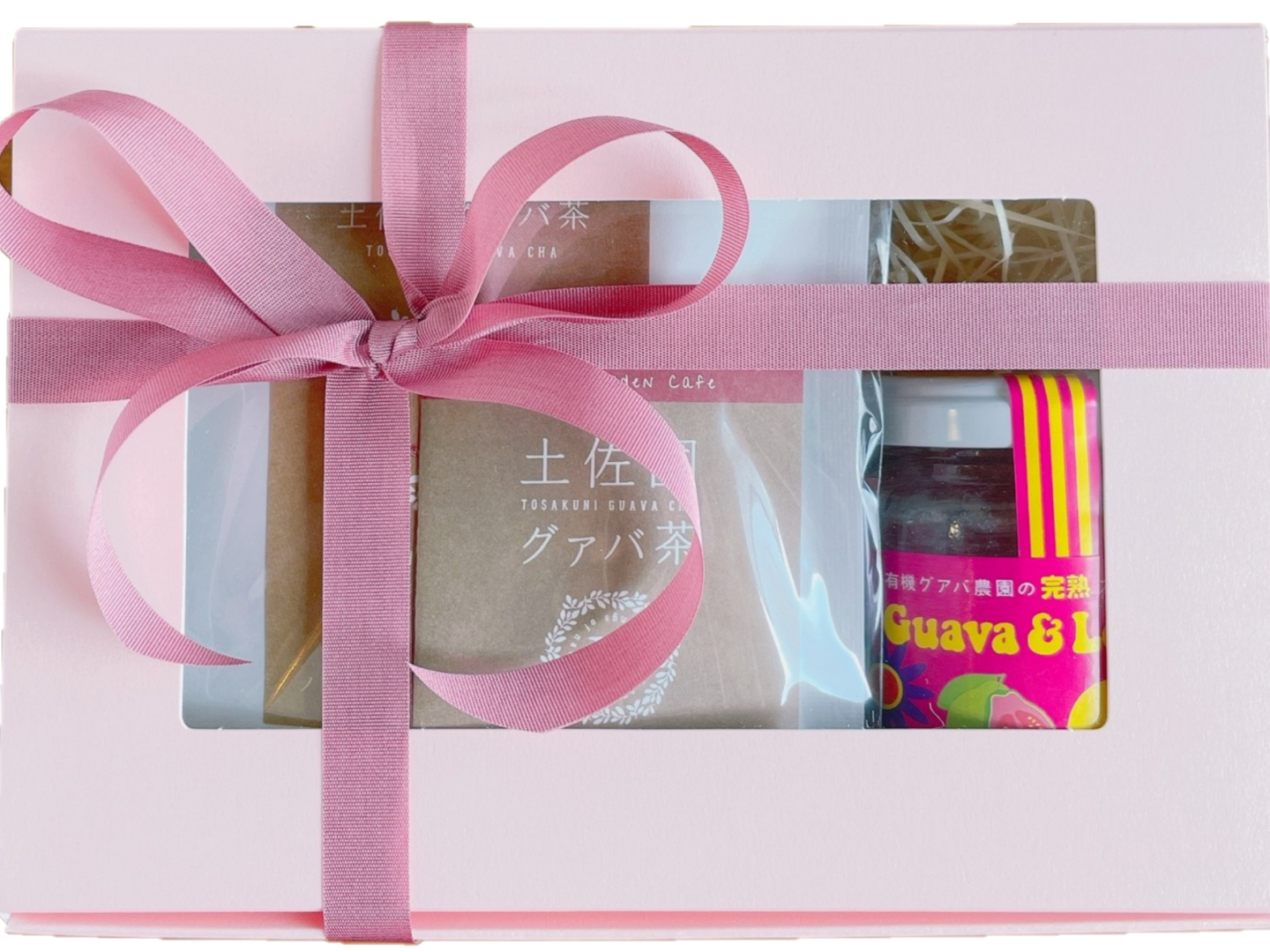グアバ茶とグアバ・レモンのフルーツソースが入った有機グアバ農園こだわりのバレンタインギフトセットです。
