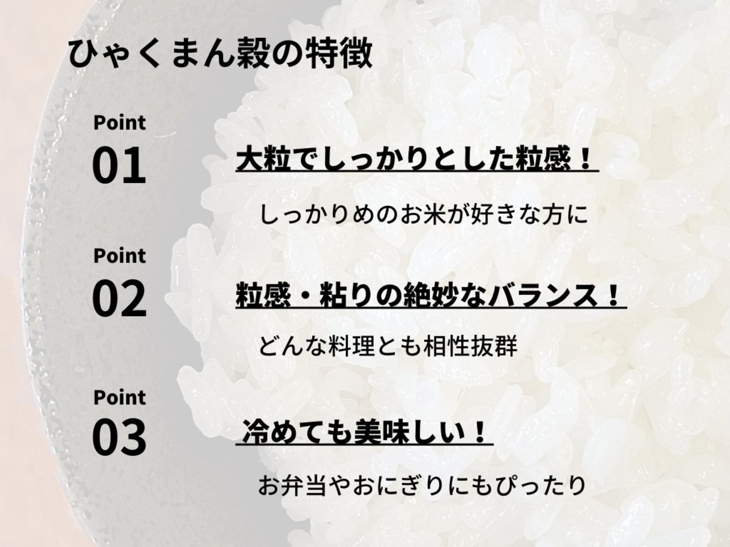 農薬の使用量を通常の半分以下に抑え、動物性と植物性をバランス良く配合した有機肥料で育った「特別栽培米ひゃくまん穀」です。