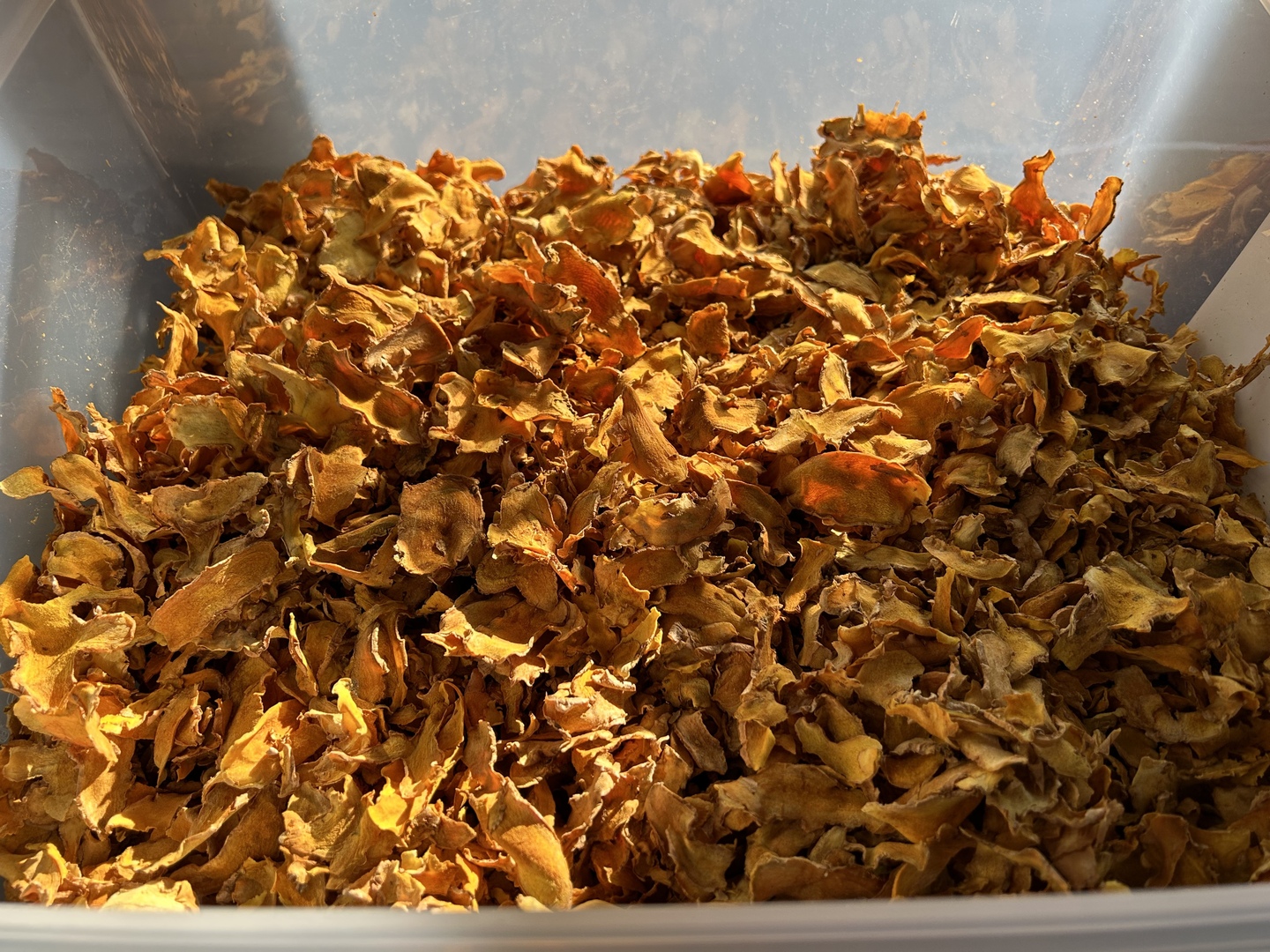 天日干しと機械による温風乾燥を行うと今度は凝縮したウコンチップスに。