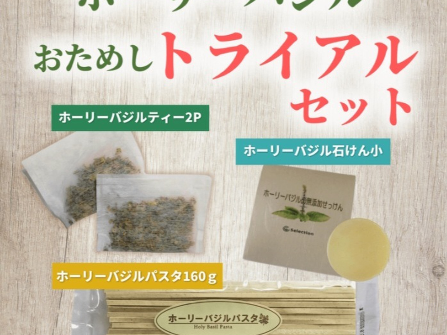・ホーリーバジルティー2パック(約2L分) ・ホーリーバジル石けん15g×1個 ・ホーリーバジルパスタ160g×1個(約2人前)