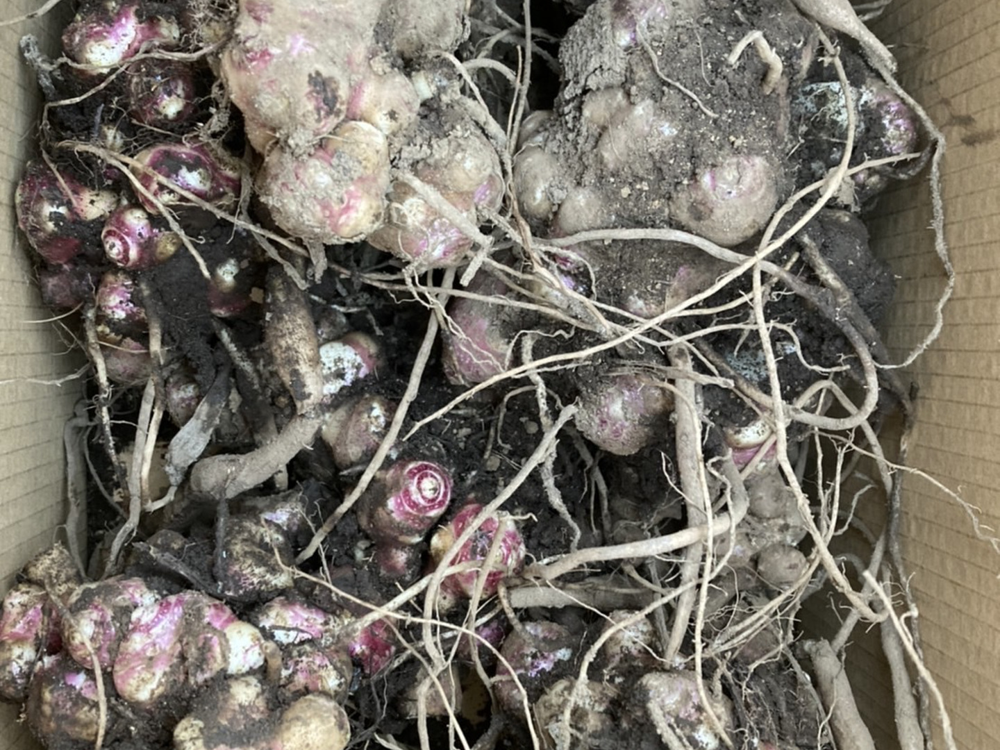土付きでお送りします。箱に入れたまま乾燥しないように保管してください。